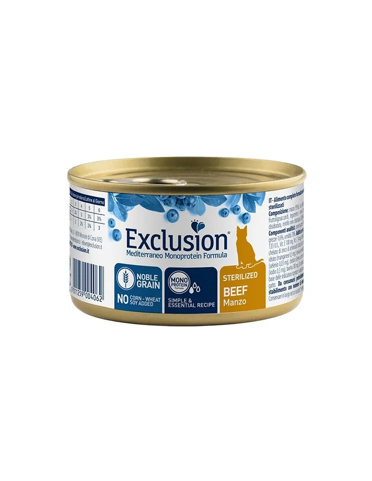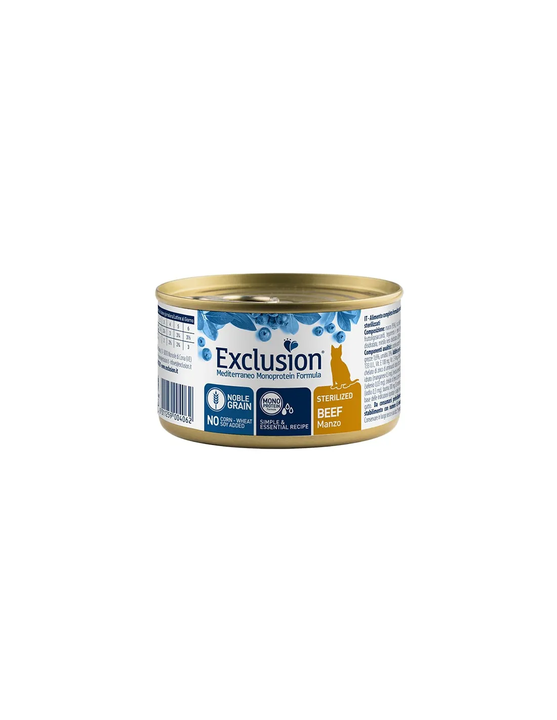 Prima di somministrare Exclusion M Ster Beef 85 g occorre considerare alcune controindicazioni e situazioni di rischio: non somministrare il prodotto ad animali con nota ipersensibilità o allergia accertata alla carne di manzo o ad uno qualsiasi degli ingredienti elencati in etichetta. In presenza di allergie alimentari sospette o diagnosticate (cutanee, gastrointestinali o sistemiche), evitare l’uso fino a che il veterinario non abbia valutato la situazione e raccomandato eventuali alternative ad hoc.