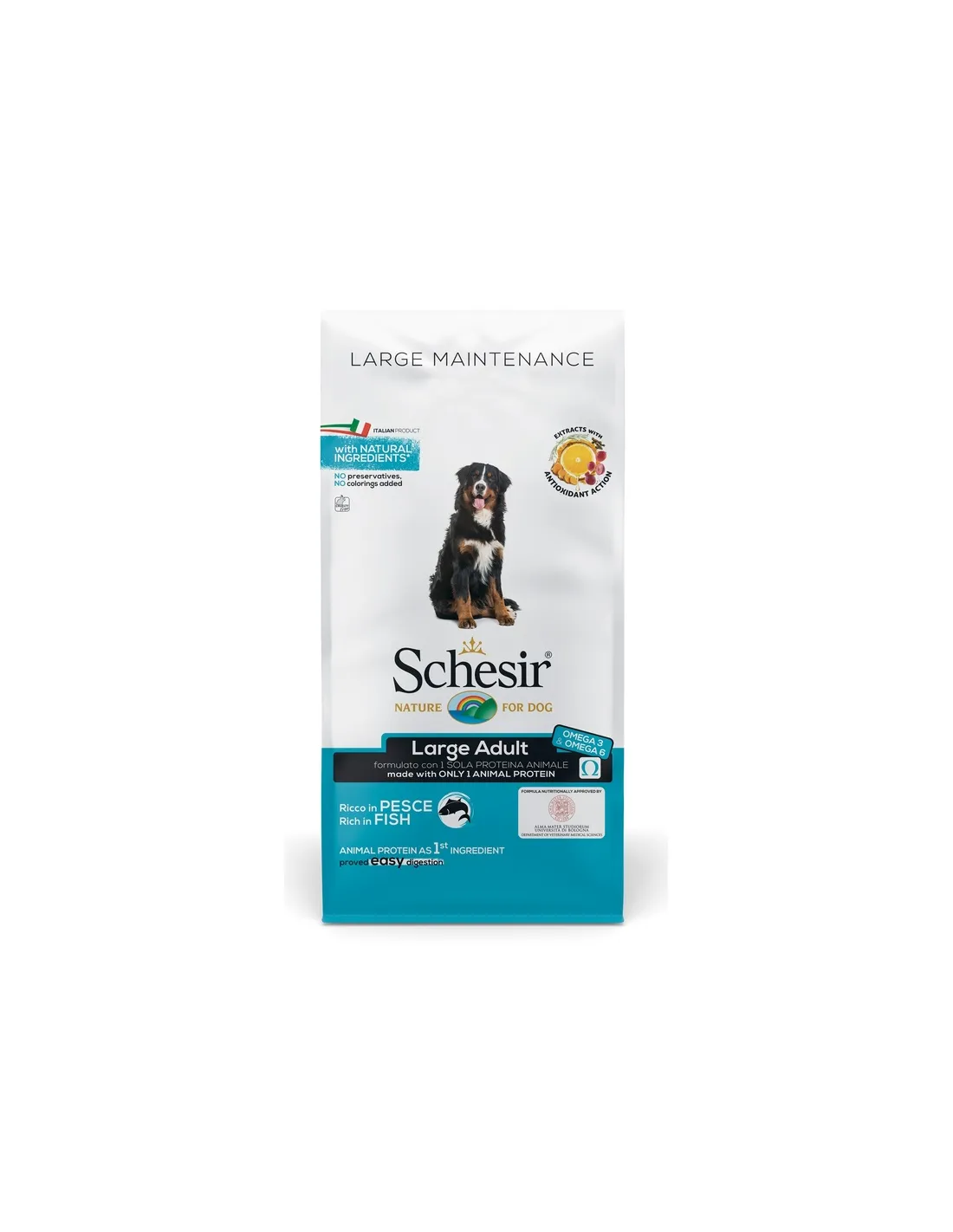 Die Zusammensetzung von Schesir Dog Large Adult Fish Monoprotein Maintenance wurde sorgfältig untersucht, um eine ausgewogene Versorgung mit essentiellen Nährstoffen zu gewährleisten und so zur Aufrechterhaltung einer optimalen körperlichen Verfassung und zur Unterstützung der lebenswichtigen Funktionen des Hundes beizutragen. Die Anwesenheit von Fisch garantiert eine hohe Verdaulichkeit und eine Versorgung mit Omega-3-Fettsäuren, die sich positiv auf die Gesundheit von Haut und Fell auswirken. Darüber hinaus ist die Formel frei von künstlichen Farb- und Konservierungsstoffen, um eine natürliche und sichere Ernährung zu gewährleisten.