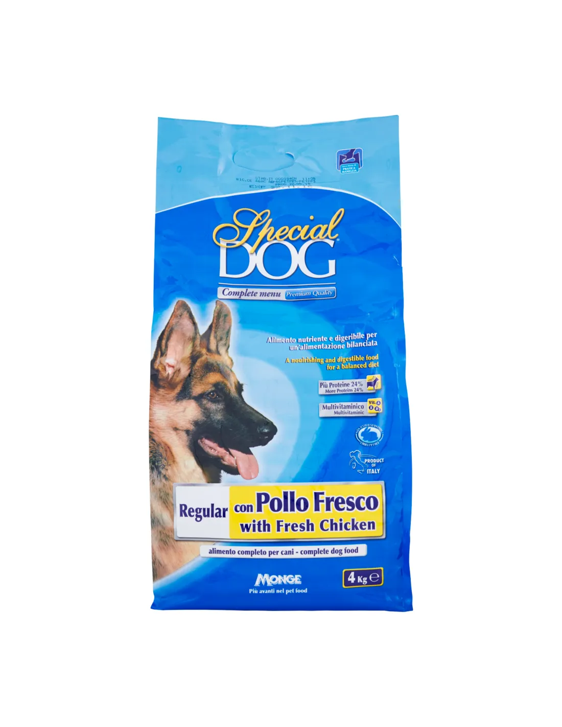 Special Dog Regular mit frischem Huhn ist für erwachsene Hunde aller Rassen geeignet, die eine ausgewogene Ernährung benötigen, um ein normales Maß an körperlicher Aktivität aufrechtzuerhalten. Es eignet sich besonders für Hunde mit Verdauungsstörungen oder für solche, die besondere Aufmerksamkeit auf die Gesundheit ihrer Haut und ihres Fells benötigen. Dieses Produkt kann als einzelnes Tagesfutter verwendet werden. Dabei sind die auf der Packung angegebenen Dosierungsempfehlungen entsprechend dem Gewicht und der Aktivität des Hundes zu beachten.