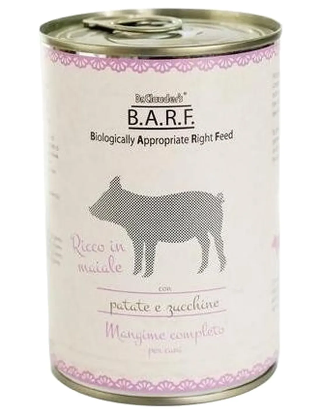 Tierische Nebenprodukte: Schweinefleisch (Fleisch, Herz, Leber, Lunge) (80 %), Karotten (5 %), Kartoffeln (5 %), Zucchini (5 %), Maniok (3 %), Mineralstoffe (1 %), Fischöl (Lebertran) (0,5 %), Pflanzenöl (Weizenkeimöl) (0,5 %).