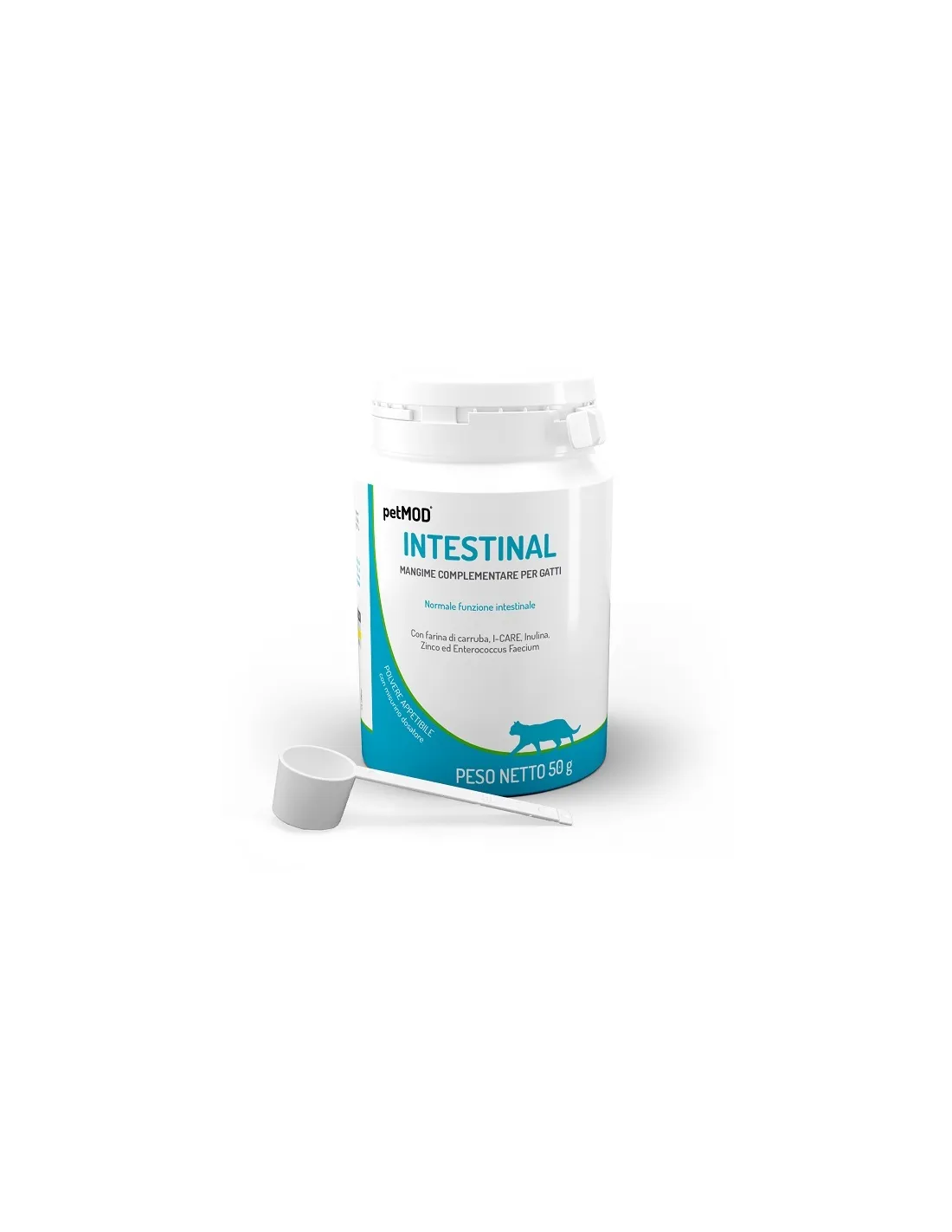 Schmackhaftes Ergänzungsfutterpulver für Katzen, formuliert mit Johannisbrotmehl, hydrolysierter i-care-Hefe, Inulin aus Zichorienwurzeln, Zinkoxid, Bentonit und Darmflora-Stabilisator – Enterococcus faecium für ein normales Darmwohl.