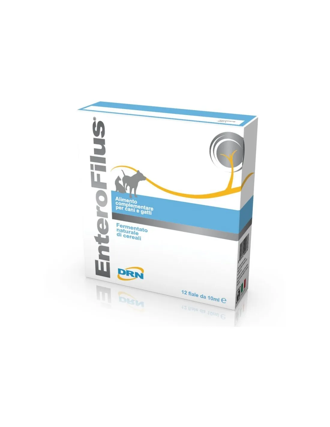 Enterofilus ist ein flüssiges Synbiotikum (Präbiotikum + Probiotikum) speziell für Hunde und Katzen, das aus der natürlichen Fermentation von Getreide gewonnen wird. Die besonderen Fermentationsbedingungen ermöglichen die Entwicklung einer ausgewählten Mikroflora aus Hefen und Laktobazillen. Es enthält außerdem MOS (Mannan-Oligosaccharide), starke Aktivatoren des unspezifischen Immunsystems, und erfüllt außerdem eine „Regulierungs“-Funktion der Darmbakterienflora. Dank seiner innovativen Formulierung verbessert Enterofilus die Darmabsorption und fördert eine schnelle Wiederherstellung der Darmfunktion nach Magen-Darm-Erkrankungen (Vergiftung, Durchfall, ...); optimiert die Aufnahme und Verdauung der Futterration und ist daher auch bei Ernährungsumstellungen (z. B. Entwöhnung von Welpen) oder bei Malabsorption angezeigt; stellt die Leistungsfähigkeit des Darmökosystems wieder her, die durch die längere Verabreichung von Medikamenten stark verändert wird; stärkt das Immunsystem.