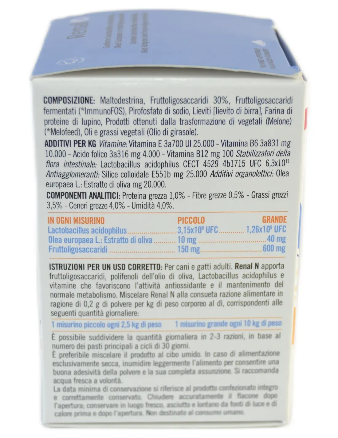 Mischen Sie renal n mit der üblichen Futterration in einer Menge von 0,2 g Pulver pro kg Körpergewicht und Tag, entsprechend den folgenden Dosierungen täglich: 1 kleiner Messlöffel pro Tag 2,5 kg Gewicht; 1 großer Messlöffel pro 10 kg Körpergewicht. Es ist möglich, die Tagesdosis je nach Anzahl der Hauptmahlzeiten auf 2-3 Gaben aufzuteilen. Verabreichen Sie renal n in 30-Tage-Zyklen gemäß den Anweisungen des Tierarztes. Am besten mischen Sie das Produkt mit Nassfutter. Bei ausschließlicher Trockenfütterung das Futter leicht anfeuchten, damit das Pulver gut haftet und vollständig aufgenommen werden kann. Es wird empfohlen, vor der Anwendung bzw. vor einer Verlängerung der Anwendungsdauer den Rat eines Tierarztes einzuholen. Wir empfehlen viel Wasser.