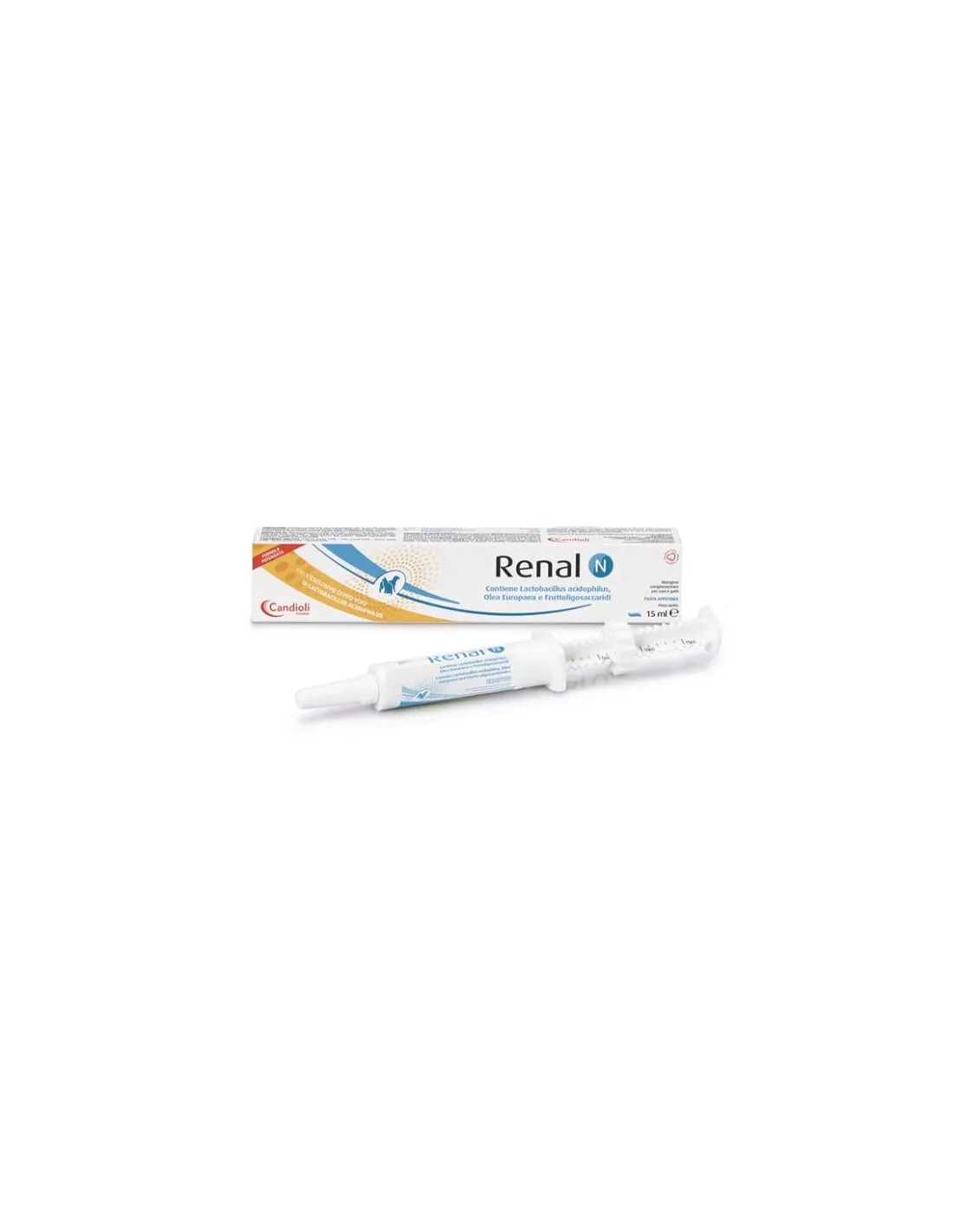 Renal n Pasta enthält Fructo-Oligosaccharide, Olivenöl-Polyphenole, Enterococcus faecium und Vitamine, die zur Aufrechterhaltung eines normalen Stoffwechsels und einer ordnungsgemäßen Darmfunktion beitragen.