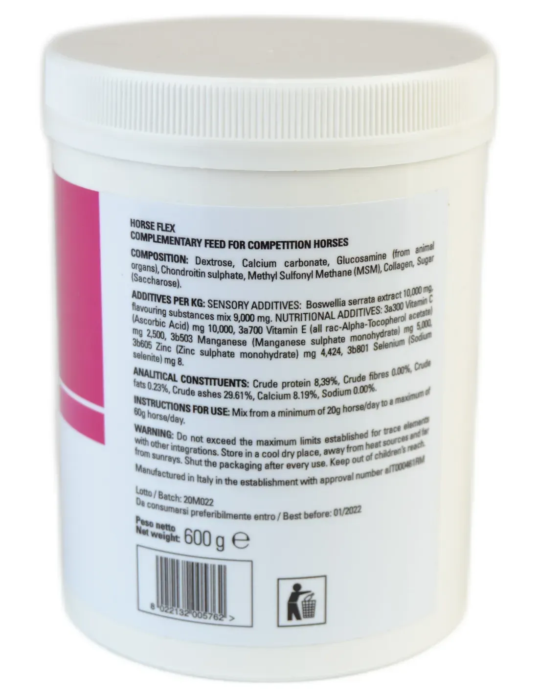 Horse Flex FM Italia-Pulver besteht aus einer ausgewogenen Mischung natürlicher und sich ergänzender Wirkstoffe, die Wirksamkeit und Sicherheit bei der Behandlung der Gelenke von Pferden gewährleisten sollen. Zu den Wirkstoffen gehören Glucosaminsulfat, Chondroitinsulfat, Methylsulfonylmethan (MSM), Hyaluronsäure und eine Auswahl an lebenswichtigen Vitaminen und Mineralstoffen wie Zink und Mangan.