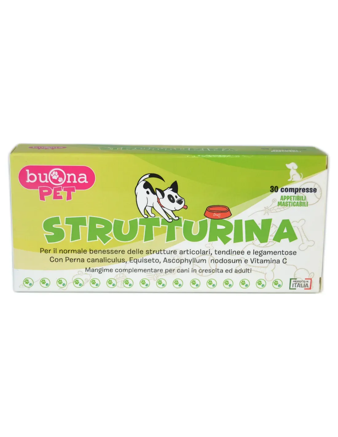 Strutturina ist ein Ergänzungsfuttermittel für heranwachsende und erwachsene Hunde, formuliert in schmackhaften Kautabletten; Reich an Perna Canaliculus, mit Schachtelhalm, der Alge Ascophyllum nodosum und Vitamin C, ist es nützlich, das normale Wohlbefinden der Gelenk-, Sehnen- und Bänderstrukturen zu fördern.