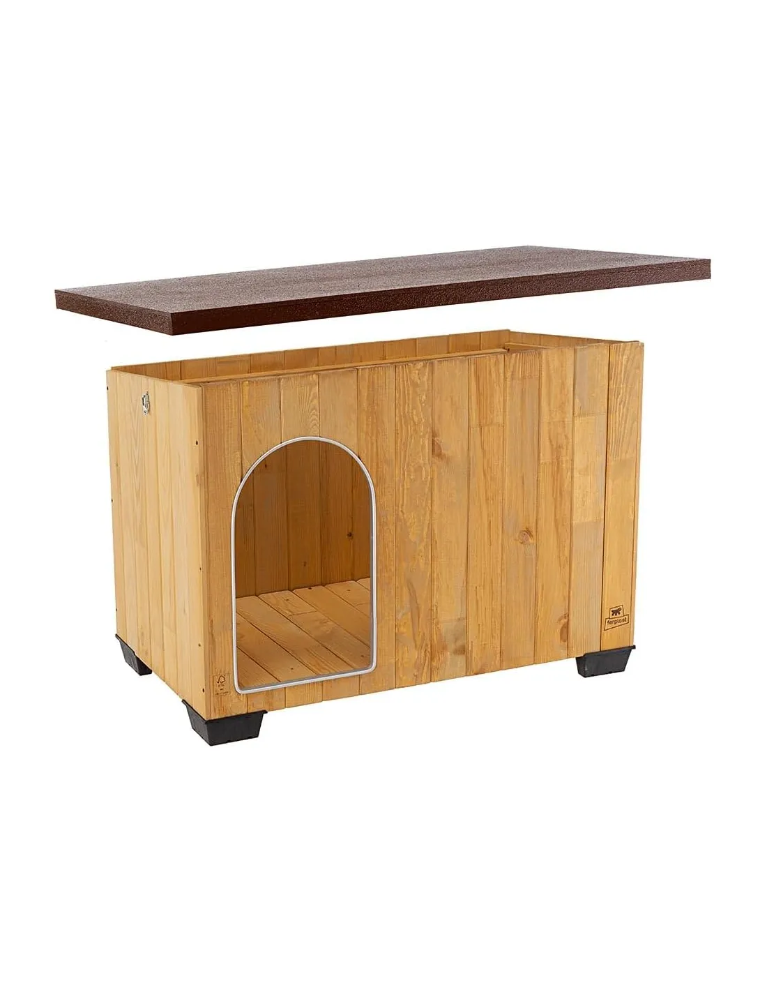Die Hütte verfügt über eine besondere Konstruktion mit einem leicht geneigten Dach, um den korrekten Abfluss des Regenwassers zu ermöglichen. Wie alle Hundehütten aus Holz von Ferplast ist sie ideal für den Außenbereich geeignet und wurde sowohl innen als auch außen mit speziellen Lackierverfahren behandelt, um maximale Haltbarkeit und Widerstandsfähigkeit gegenüber allen klimatischen Bedingungen zu gewährleisten. Das Holz wird tatsächlich durch eine ökologische, ungiftige und schimmelhemmende Imprägnierungsfarbe geschützt, die gegen UV-Strahlen beständig ist. und wasserabweisend, aufgetragen im Flutverfahren.