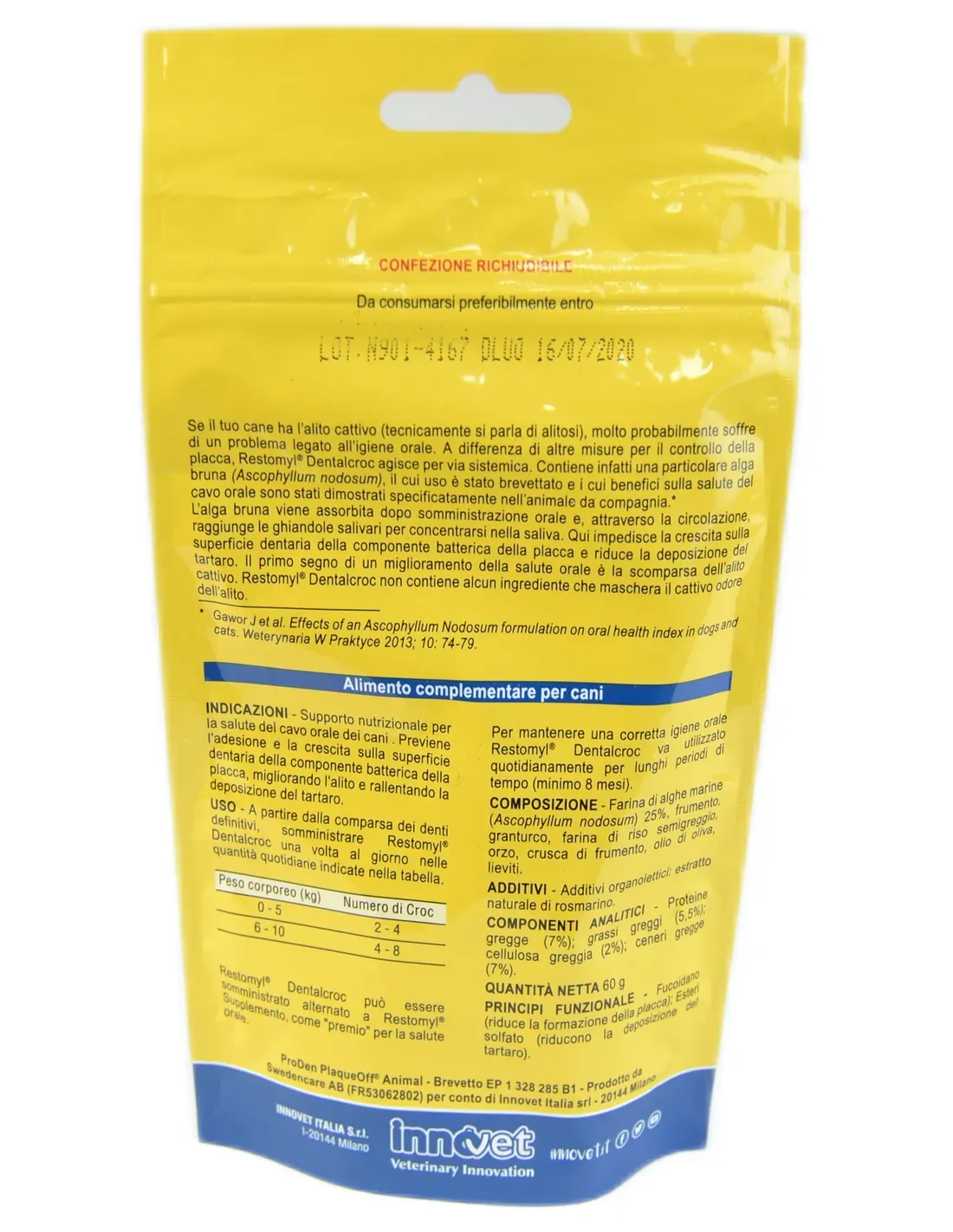 Ernährungsunterstützung für die Gesundheit der Mundhöhle des Hundes. Es verhindert die Anhaftung und das Wachstum der bakteriellen Plaquekomponente auf der Zahnoberfläche, verbessert die Atmung und verlangsamt die Zahnsteinablagerung. Es wirkt systemisch. Tatsächlich enthält es eine besondere Braunalge (Ascophyllum nodosum), deren Verwendung patentiert ist und deren Vorteile für die Gesundheit der Mundhöhle speziell bei Haustieren nachgewiesen wurden.