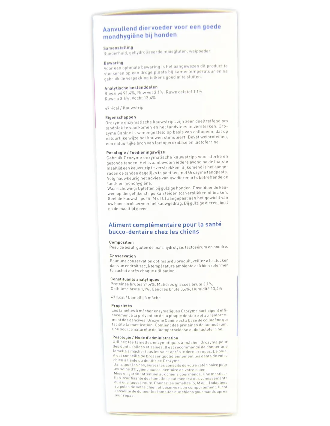 Der kaubare Enzymstick trägt wirksam zur Vorbeugung von Zahnbelag und zur Stärkung des Zahnfleisches bei. Orozyme canine auf Kollagenbasis erleichtert das Kauen. Die Kaustreifen bekämpfen die Bildung von Plaque und Zahnstein, kontrollieren unangenehmen Atem und stillen das natürliche Kaubedürfnis des Hundes. Die kombinierte enzymatische und mechanische Wirkung der Kaustreifen hält die Mundhöhle über lange Zeiträume gesund. Die hohe Schmackhaftigkeit und Konsistenz der Streifen machen die Zahnhygiene Ihres Hundes einfach und unangenehm.
