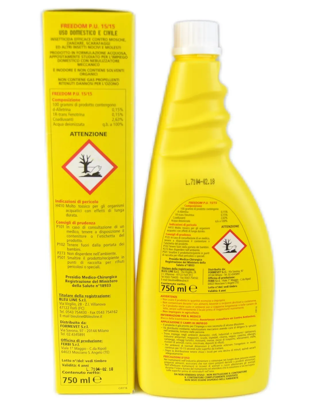 Wirksames Insektizid gegen Fliegen, Mücken, Kakerlaken und andere schädliche und lästige Insekten. Produkt in wässriger Formulierung, speziell für den Hausgebrauch mit mechanischem Zerstäuber entwickelt. Es ist geruchlos und enthält keine organischen Lösungsmittel. Es enthält keine Treibgase, die als schädlich für die Ozonschicht gelten. Das Produkt ist gebrauchsfertig und erfordert keine Verdünnung. Es sollte mit einem mechanischen Zerstäuber verteilt werden, wobei darauf zu achten ist, dass das Spray in die Umgebung und von Menschen ferngehalten wird. Es wird in häuslichen, zivilen, industriellen und zootechnischen Umgebungen eingesetzt (Wohnhäuser, Lebensmittelindustrie, Lagerhäuser, Schulen, Krankenhäuser, Kinos, Geschäfte, Kasernen, Hotels, Campingplätze, Touristendörfer, Restaurants, Kantinen, Transportmittel, Zuchtbetriebe, Ställe, Tierheime, Zwinger, Düngemittelhaufen, Mülldepots).