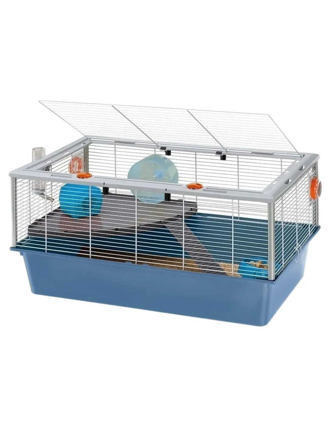 Criceti 15 ist ein großer Hamsterkäfig mit einem großen Kunststoffboden, der verhindert, dass Streu herausläuft. Der Lebensraum zeichnet sich durch eine Struktur mit Kunststoffsäulen und Oberrahmen sowie einem Netzdach mit Sicherheitsschlössern aus. Ein geräumiges Regal mit Leiter unterteilt den Käfig in zwei Etagen, die auf die unterschiedlichen Aktivitäten des kleinen Nagers ausgelegt sind: Die untere Etage, ruhiger, eignet sich zum Ausruhen, die obere zum Fressen, Trinken und Spielen. Criceti 15 ist perfekt bewohnbar und wird mit einem Rasthaus, einer Trinkflasche, einer Schüssel und einem Rad geliefert. Das Innenzubehör kann jedoch je nach den Bedürfnissen des Tieres unterschiedlich positioniert werden. Dieser modulare Lebensraum ist auch für den Anschluss an andere Wohnmodule, Röhren oder Zubehörteile für Hamster konzipiert.
