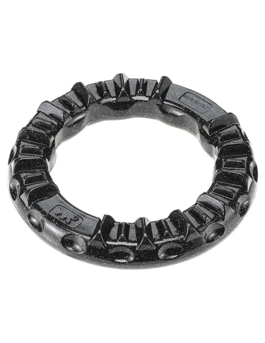 Das Zahnspielzeug Ferplast Smile mit großem schwarzen Ring besteht aus widerstandsfähigem thermoplastischem Gummi und soll dabei helfen, die Zähne des Hundes beim Spielen zu reinigen. Die Ringform regt das Kauen an und hilft, Plaque und Zahnstein zu entfernen.