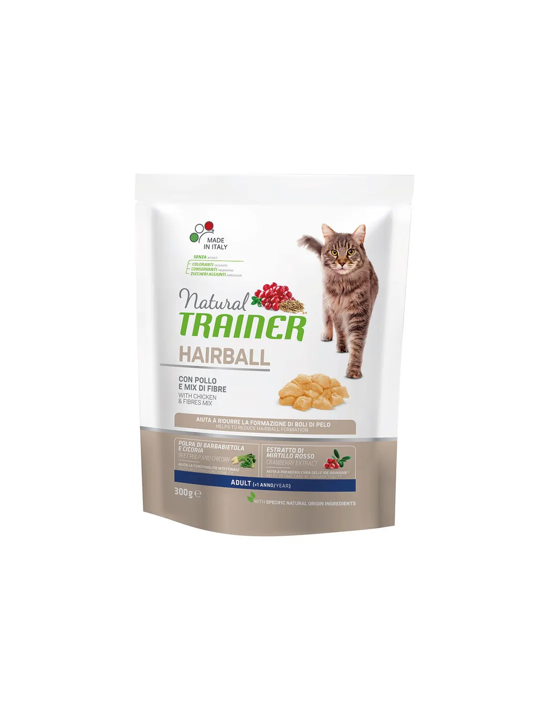 Hauptzutaten: Huhn (4 %), frisches Schweinefleisch (4 %), Rindfleisch. Fasern: Erbsenfaser, Zellulose, Haferfaser. Kohlenhydrate: Maisstärke, Kartoffelstärke. Spezifische Bestandteile: Getrocknete Zichorienwurzel (Quelle für Inulin), Dextrose, getrocknete Cranberry (0,01 %).