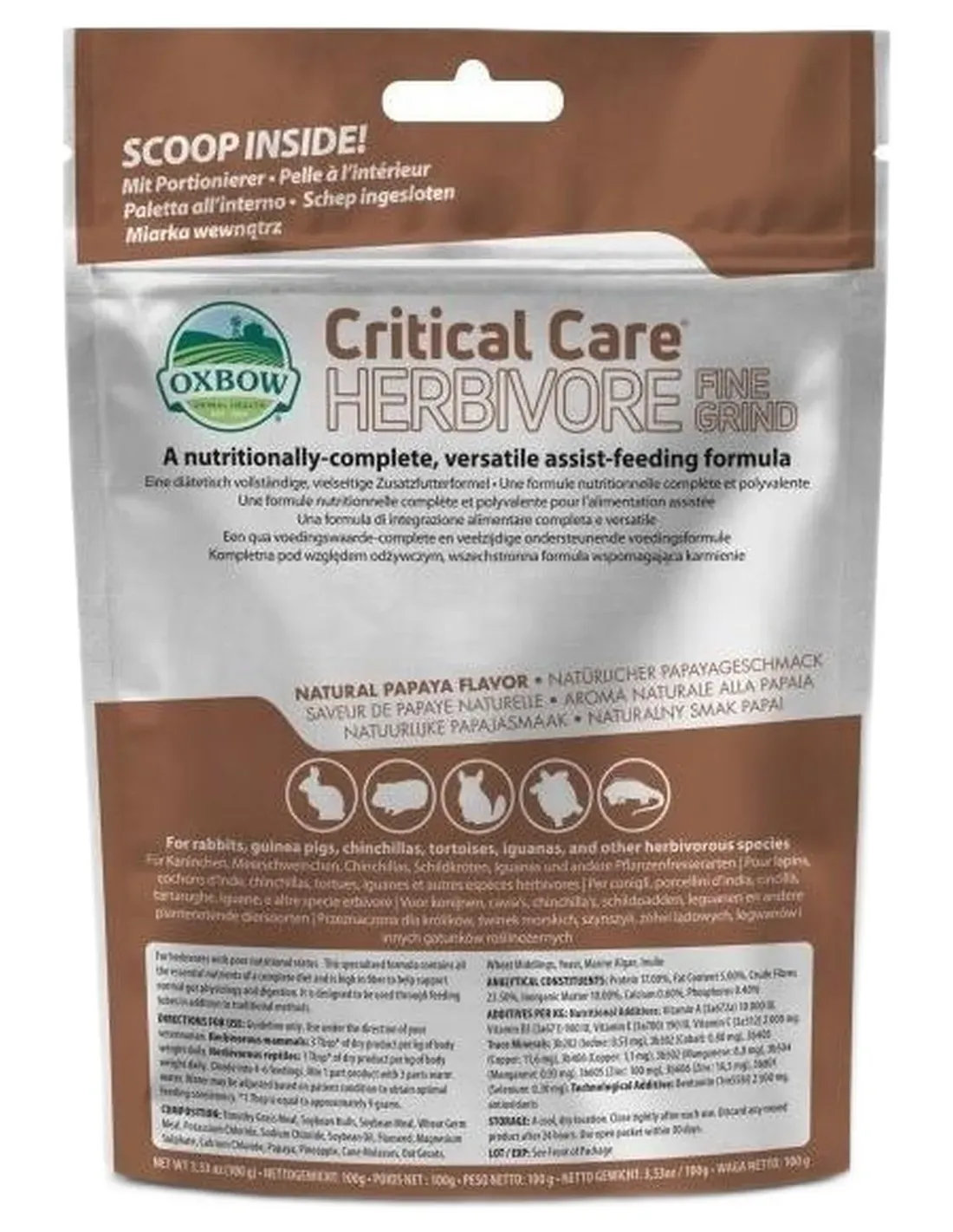 Mischen Sie 1 Teil Critical Care FINE GRIND mit 3 Teilen heißem Wasser. Um die optimale Konsistenz zu erhalten, kann die Wassermenge angepasst werden. Teilen Sie die erhaltene Mischung auf 4-6 Mahlzeiten täglich auf oder befolgen Sie die Anweisungen des Tierarztes Ihres Vertrauens. Verabreichen Sie die erhaltene Mischung über Spritzen (OHNE NADEL) oder Ernährungssonden. Waschen Sie alle in der Spritze verbliebenen Rückstände nach jedem Gebrauch mit heißem Wasser aus, um zu verhindern, dass das Produkt im Inneren aushärtet und die Tube verstopft. Halten Sie immer frisches Wasser für Ihr Haustier bereit.