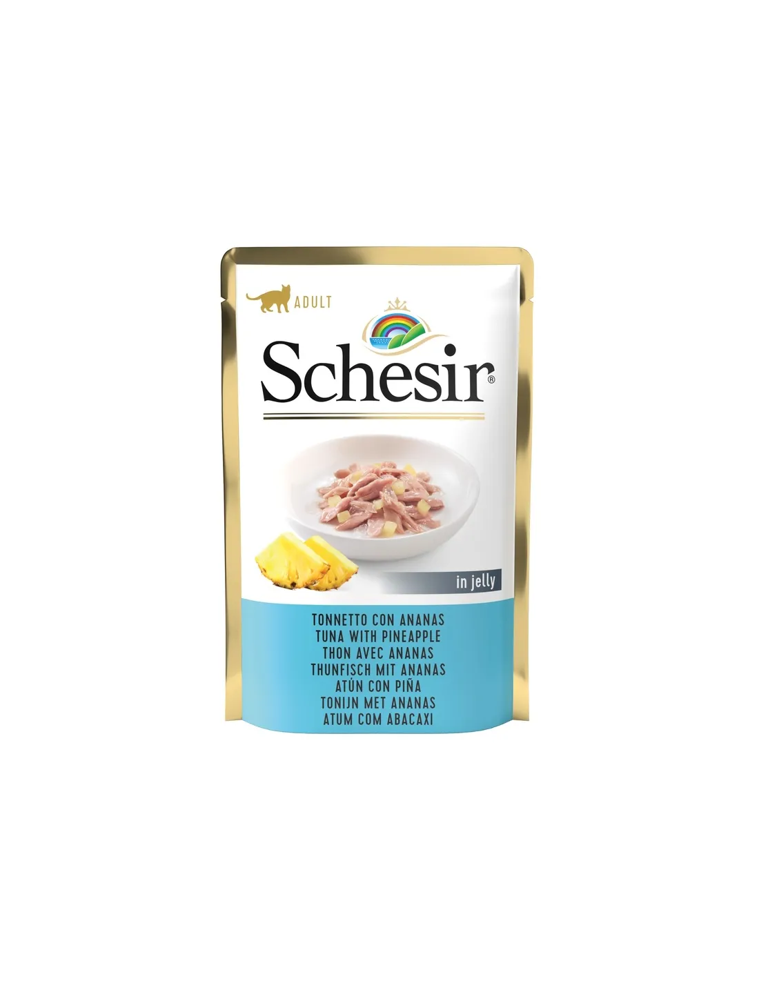 Schesir Cat Thunfisch und Ananas ist ein hochwertiges Nassfutter für ausgewachsene Katzen, erhältlich in 85-g-Beuteln. Dieses Produkt zeichnet sich durch seine Tierversuchsfreiheit und die Verwendung von 100 % natürlichen Inhaltsstoffen aus und bietet Ihrer Katze eine ausgewogene und schmackhafte Ernährung.