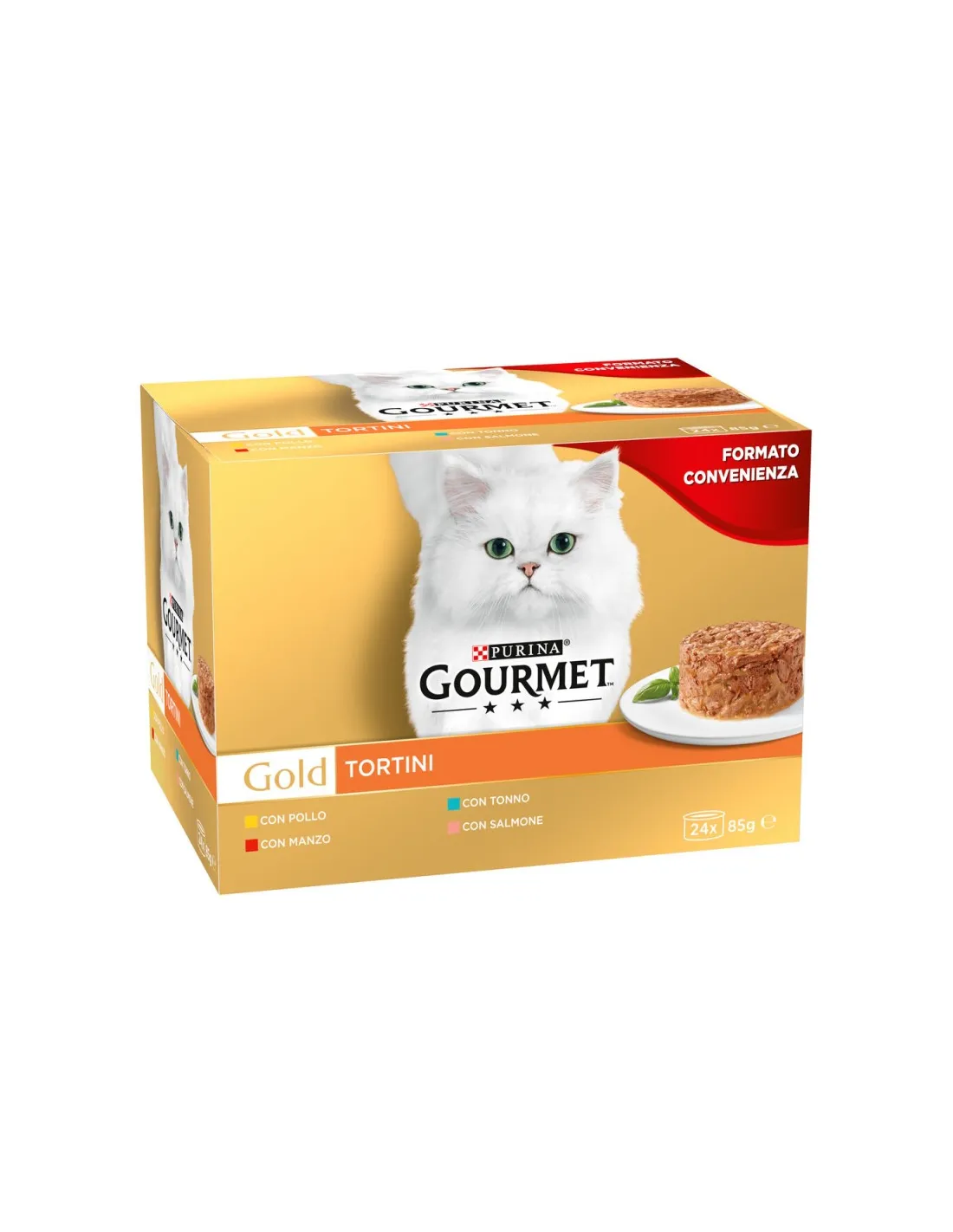 Gourmet Gold Tortini ist ein Alleinfuttermittel für ausgewachsene Katzen. Es besteht aus zart gegartem Fleisch oder Fisch in eigener Soße. Das Gourmet Gold Tortini Nassfutter für Katzen ist im Multipack mit 24 Packungen à 85g wie folgt erhältlich: 6x85g Rind, 6x85g Huhn, 6x85g Lachs, 6x85g Thunfisch.