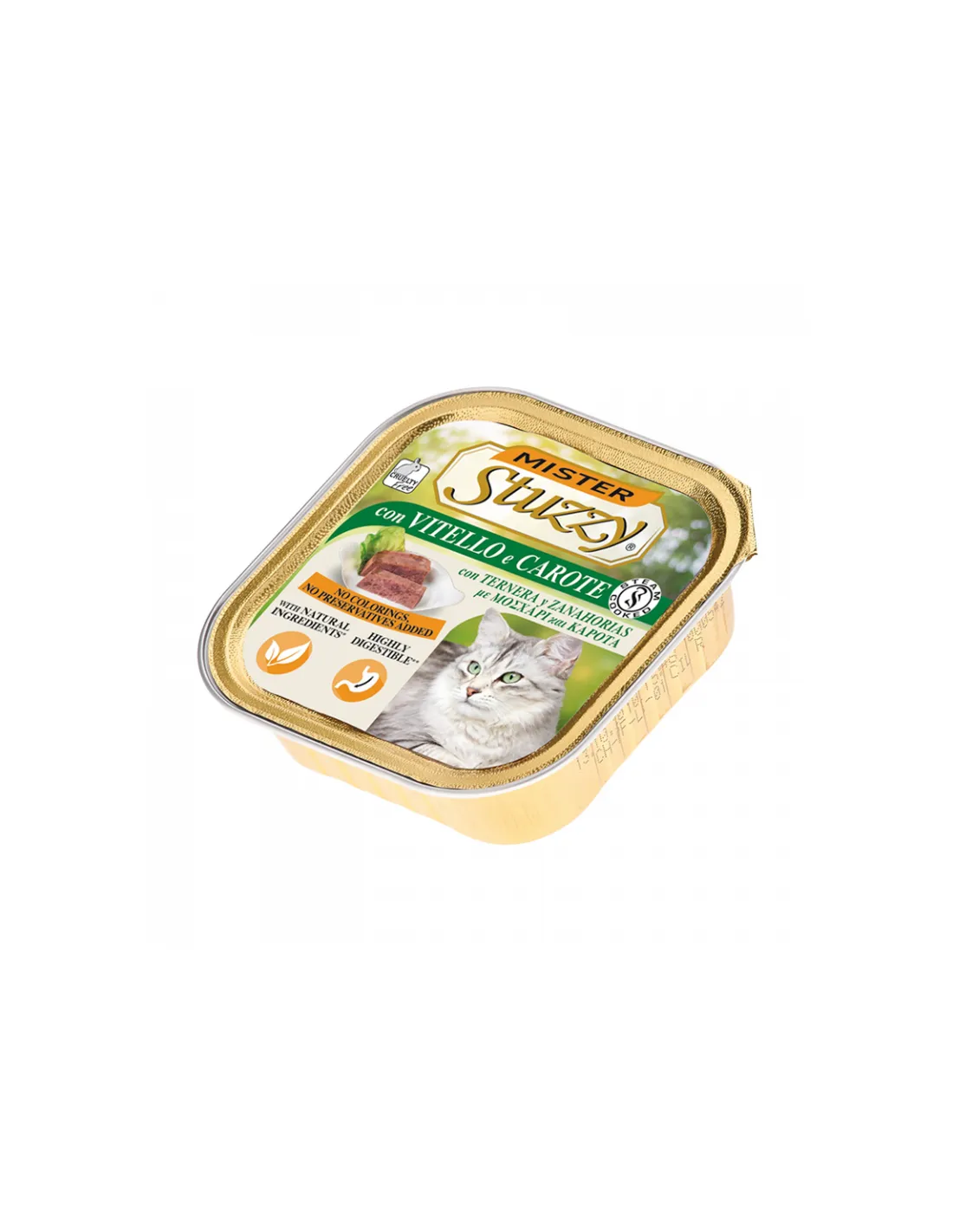 Mister Stuzzy Cat mit Kalbfleisch und Karotten ist ein hochwertiges Nassfutter für Katzen, präsentiert in praktischen 100-g-Schalen. Dieses Produkt wurde entwickelt, um den anspruchsvollsten Gaumen von Katzen zu befriedigen und eine schmackhafte und nahrhafte Mahlzeit zu bieten.