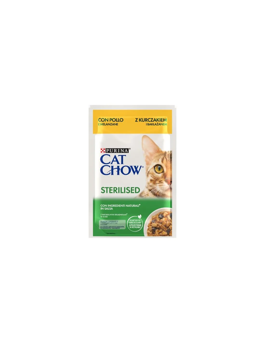 Purina Chow Cat für sterilisierte Katzen mit Huhn und Aubergine ist ein komplettes und ausgewogenes Futter, präsentiert in praktischen 85-g-Beuteln. Dieses Produkt wurde speziell für die Ernährungsbedürfnisse kastrierter Katzen entwickelt und hilft ihnen, ein ideales Körpergewicht und eine optimale körperliche Verfassung zu erhalten.
