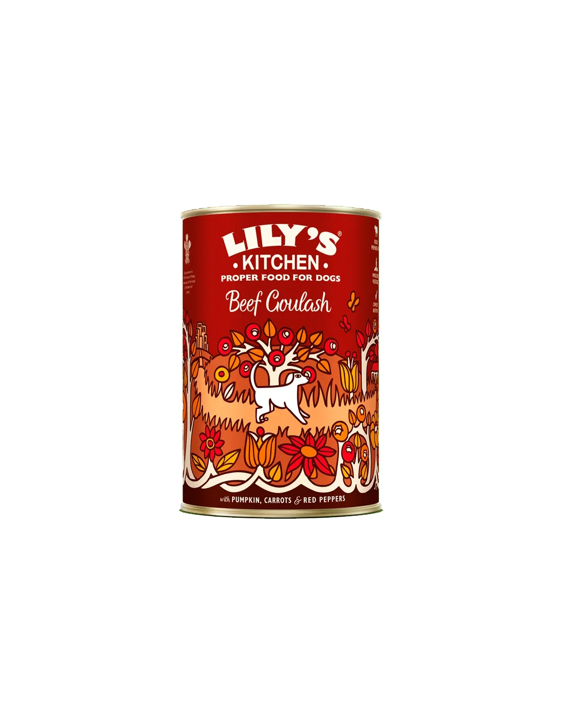 Lily's Kitchen Rindergulasch für Hunde ist ein hochwertiges Nassfutter für Hunde, erhältlich in Packungen zu 6 x 400 g. Dieses Produkt verfügt über einen neuen Rindfleischgeschmack, angereichert mit Spinat, Kürbis, Karotten und rotem Pfeffer.