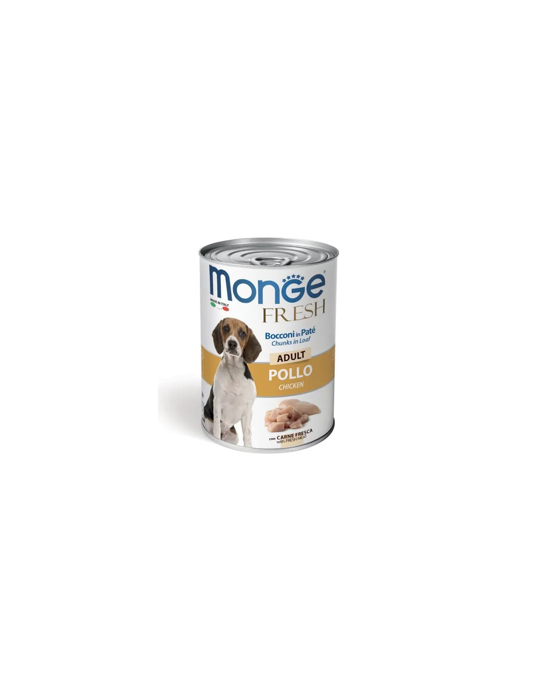 Monge Fresh ADULT CHICKEN ist ein Nassfutter für erwachsene Hunde, das eine vollständige und ausgewogene Ernährung bietet. Dieses Produkt besteht aus zarten Pastetenhäppchen, angereichert mit frischem Hühnerfleisch, was nicht nur eine hohe Verdaulichkeit, sondern auch einen hohen biologischen Wert garantiert. Die 400-g-Packung ist ideal für die Gesunderhaltung Ihres Hundes und versorgt ihn mit allen Nährstoffen, die er für sein tägliches Wohlbefinden benötigt.