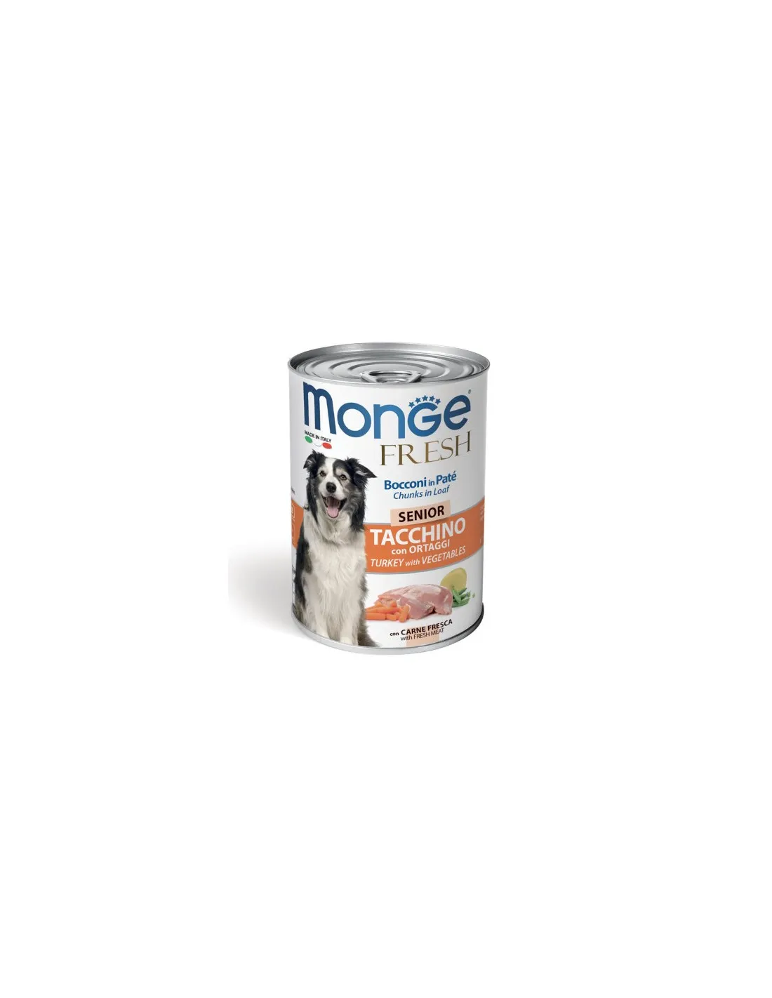 Monge Fresh Chunks in Turkey Paté mit Gemüse – Senior ist ein komplettes und ausgewogenes Futter für ausgewachsene Hunde. Dieses Produkt ist in 400-g-Packungen erhältlich und bietet eine optimale Ernährung für Ihren Vierbeiner.