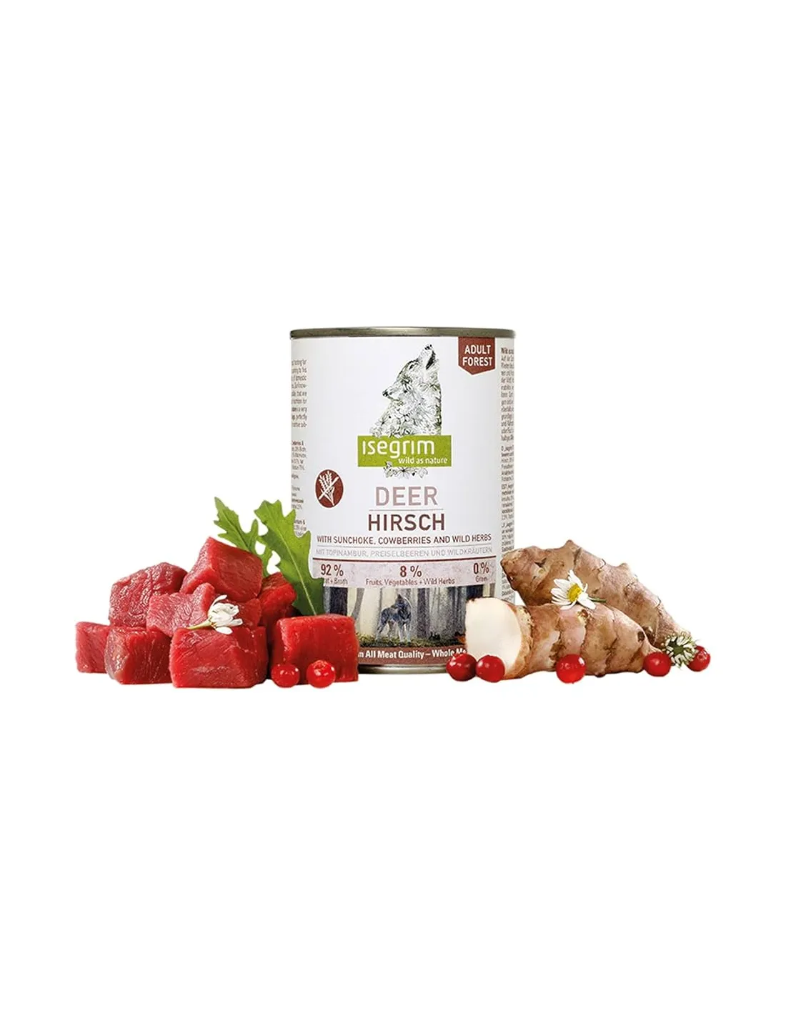 Isegrim Wild Adult Wet für Hunde ist frei von Weizen, Soja, Zucker, künstlichen Farbstoffen, künstlichen Aromen und Konservierungsstoffen. Es enthält keine rekonstruierten Fleisch- oder Knochenstücke und gewährleistet so ein Produkt von höchster Qualität. Erhältlich in 400g-Packungen ist es ideal für eine ausgewogene und schmackhafte tägliche Ernährung.