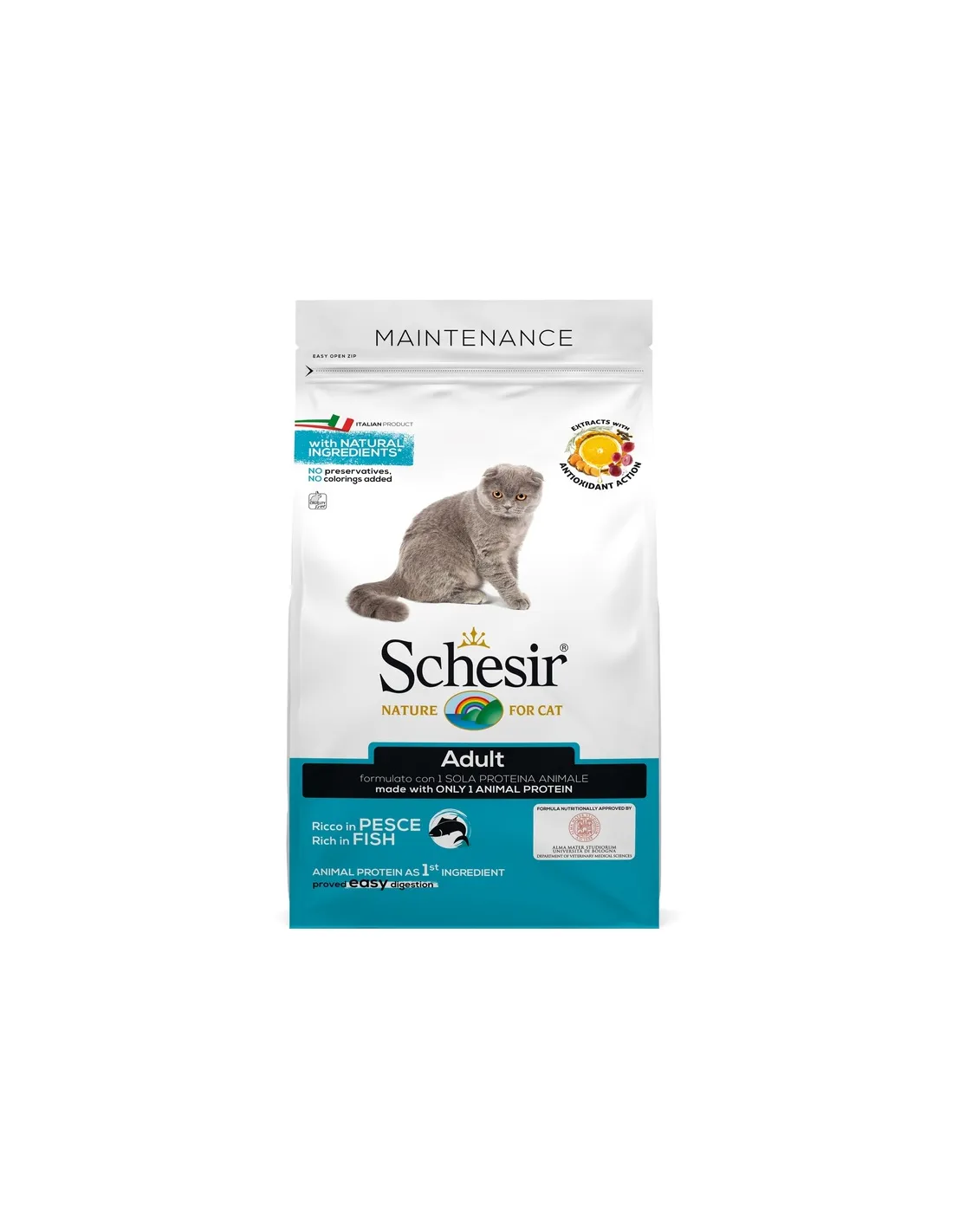Die Zusammensetzung von Schesir Rich in Fish Maintenance umfasst verarbeitete Fischproteine (25 %), Reis, Gerste und gereinigtes tierisches Fett als Hauptenergie- und Nährstoffquellen. Die Formel ist für eine ausgewogene Proteinaufnahme mit Kartoffelprotein und Maisgluten angereichert, während Rote-Bete-Fruchtfleisch und Fructooligosaccharide (FOS) zum Wohlbefinden des Verdauungssystems beitragen. Natürliche Inhaltsstoffe wie Bierhefe, Leinsamen und Sonnenblumenöl liefern Vitamine und Fettsäuren, die für ein gesundes Fell und eine gesunde Haut unerlässlich sind. Das Vorhandensein von Extrakten aus aromatischen Pflanzen wie Trauben, Zitrusfrüchten, Nelken, Kurkuma und Rosmarin verleiht dem Produkt antioxidative Eigenschaften.