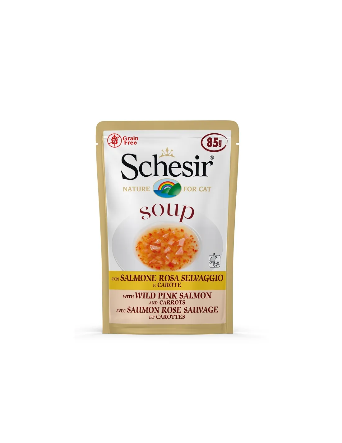 Schesir Cat Soup ist eine köstliche Katzensuppe, die den reichen Geschmack von wildem rosa Lachs mit der Süße von Karotten kombiniert und so eine ideale Ergänzung zu einer Nassmahlzeit für erwachsene Katzen ergibt. Diese Suppe kann entweder als Einzelgericht oder als Ergänzung zu Trockenfutter serviert werden und bietet ein abwechslungsreiches und anregendes kulinarisches Erlebnis für den Gaumen Ihrer Katze. Die 85-g-Version wurde entwickelt, um Frische und praktische Anwendung zu gewährleisten, sodass Sie problemlos die richtige Portion ohne Abfall servieren können.