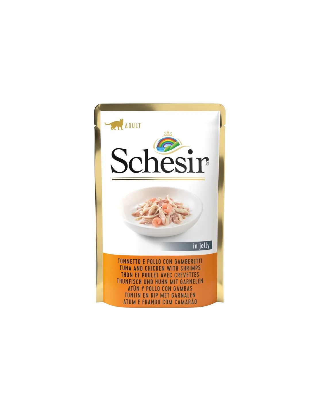 Schesir, Nassfutter für ausgewachsene Katzen mit Thunfisch- und Hühnergeschmack mit Schinken, ist ein hochwertiges Futter, das Ihrer Katze ein einzigartiges kulinarisches Erlebnis bietet. Dieses in 85-Gramm-Beuteln präsentierte Produkt verbindet den Geschmack des Meeres mit dem der Erde und bietet ein weiches Gelee, das die mit Schinken angereicherten Thunfisch- und Hähnchenfilets umhüllt. Die Gesamtmenge von 1,7 kg sorgt für eine schmackhafte und nahrhafte Ernährung Ihrer Katze.