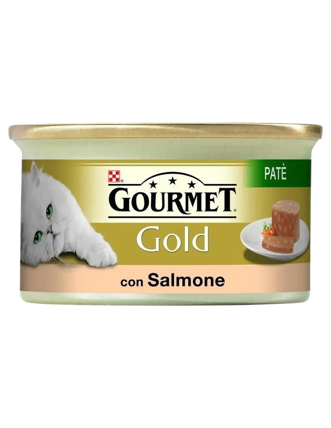 Gourmet-Goldpastete mit Lachs 85 g, köstliche Stücke von fein geschnittenem Fleisch oder Fisch kombiniert mit zarten Häppchen, um Ihrer Katze den Genuss einer leichten und appetitlichen Konsistenz zu bieten.