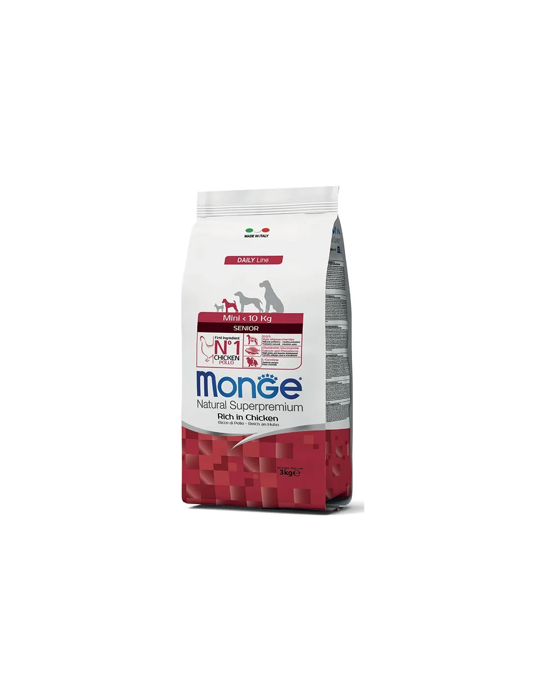 „Monge Natural Superpremium Mini Senior Rich in Chicken“ ist ein komplettes und ausgewogenes Futter, das speziell für kleine ältere Hunde mit einem Gewicht von weniger als 10 kg entwickelt wurde. Dieses Produkt ist das Ergebnis sorgfältiger italienischer Forschung und bietet eine optimale Mischung hochwertiger Inhaltsstoffe, um das allgemeine Wohlbefinden Ihres vierbeinigen Freundes zu gewährleisten.