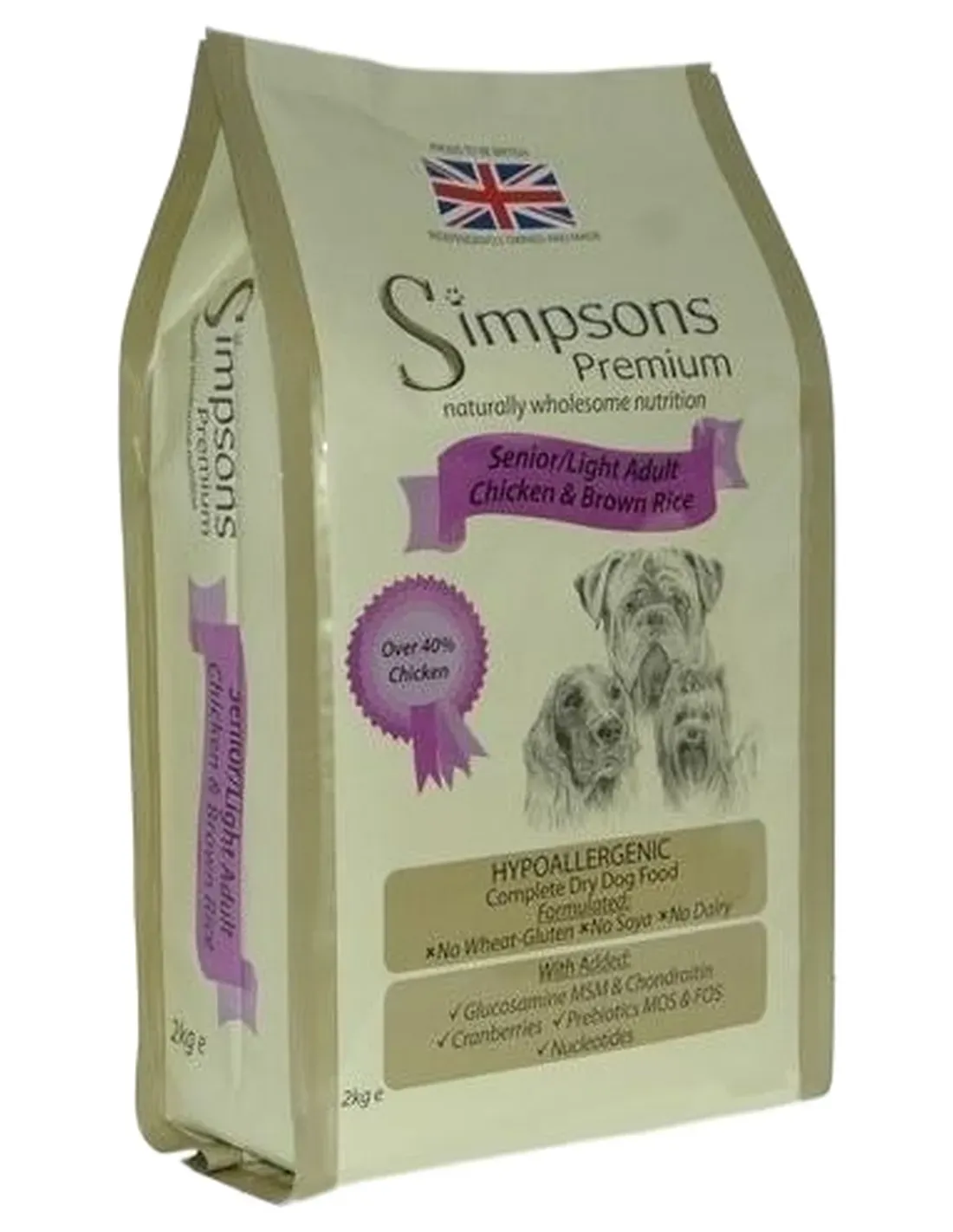 Die Simpsons Premium Dog Senior Light Chicken and Brown Rice-Kroketten, hier in der 12-kg-Packung, sind ideal für ältere oder übergewichtige Hunde und bestehen aus erstklassigen Zutaten.