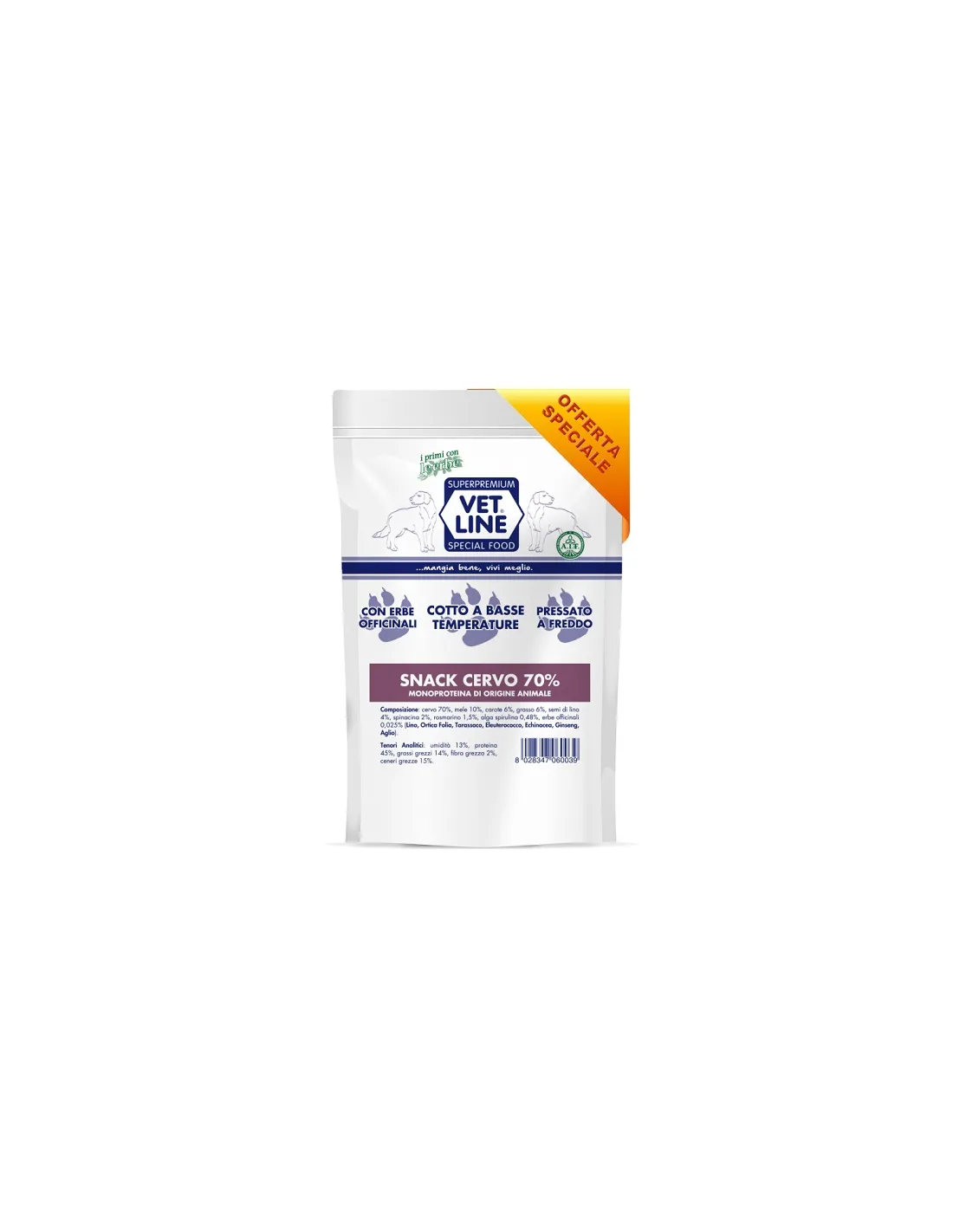 Die Zusammensetzung von Vet Line Snack Deer Monoprotein Grain Free ist sorgfältig ausbalanciert, um eine vollständige und gesunde Ernährung zu gewährleisten. Wild macht 70 % der Formel aus, gefolgt von Äpfeln (10 %), Karotten (6 %), Fett (6 %), Leinsamen (4 %), Spinat (2 %), Rosmarin (1,5 %), Spirulina-Algen (0,48 %) und einer Mischung aus Heilkräutern (0,025 %). Diese Inhaltsstoffe wurden aufgrund ihrer ernährungsphysiologischen Eigenschaften und ihres Beitrags zum allgemeinen Wohlbefinden des Hundes ausgewählt.