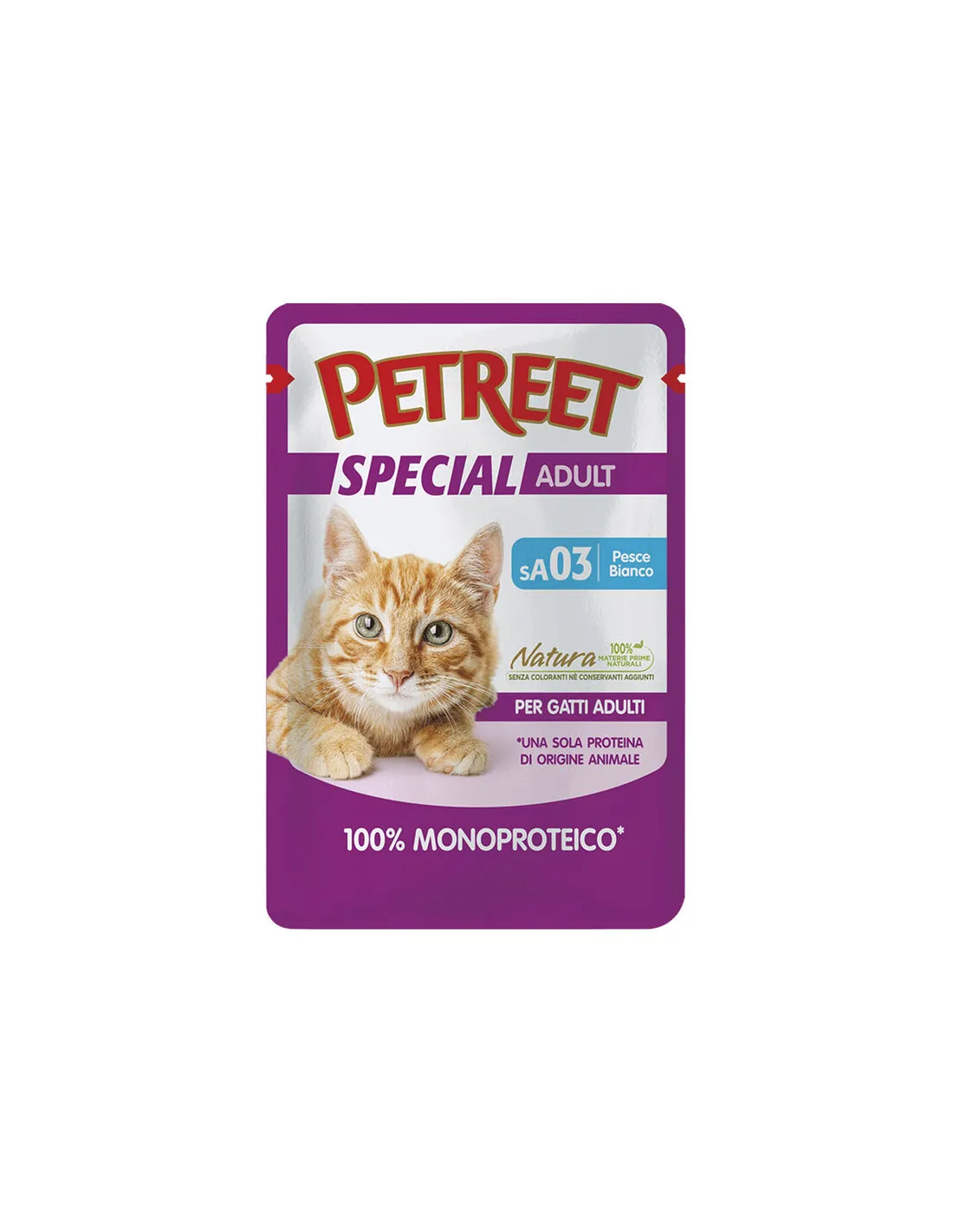 Die Zusammensetzung von Petreet Monoprotein White Fish gewährleistet eine ausgewogene Versorgung mit essentiellen Nährstoffen, trägt zur Aufrechterhaltung einer optimalen körperlichen Verfassung bei und unterstützt das allgemeine Wohlbefinden der Katze. Der versiegelte Beutel bewahrt die Frische und Unversehrtheit der Zutaten und garantiert so jedes Mal eine schmackhafte und nahrhafte Mahlzeit. Das einfache Öffnen und die praktische Anwendung machen dieses Produkt zur idealen Wahl für Katzenbesitzer, die ihrem Haustier hochwertige Nahrung bieten möchten, ohne auf Komfort zu verzichten.