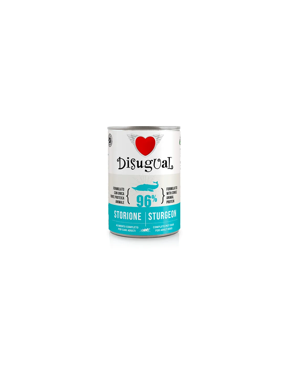 Disugual Sturgeon ist ein komplettes Nassfutter für erwachsene Hunde, das aus einer einzigen tierischen Proteinquelle, dem Stör, besteht, der 96 % des Produkts ausmacht. Die restlichen 4 % bestehen aus pflanzlicher Gelatine, Vitaminen und Mineralsalzen. Es enthält keine künstlichen Konservierungsstoffe, Farb- oder Aromastoffe. Es handelt sich um ein gluten- und getreidefreies Produkt, das in Italien aus ausgewählten Rohstoffen hergestellt wird. Jede Dose hat ein Format von 400g.
