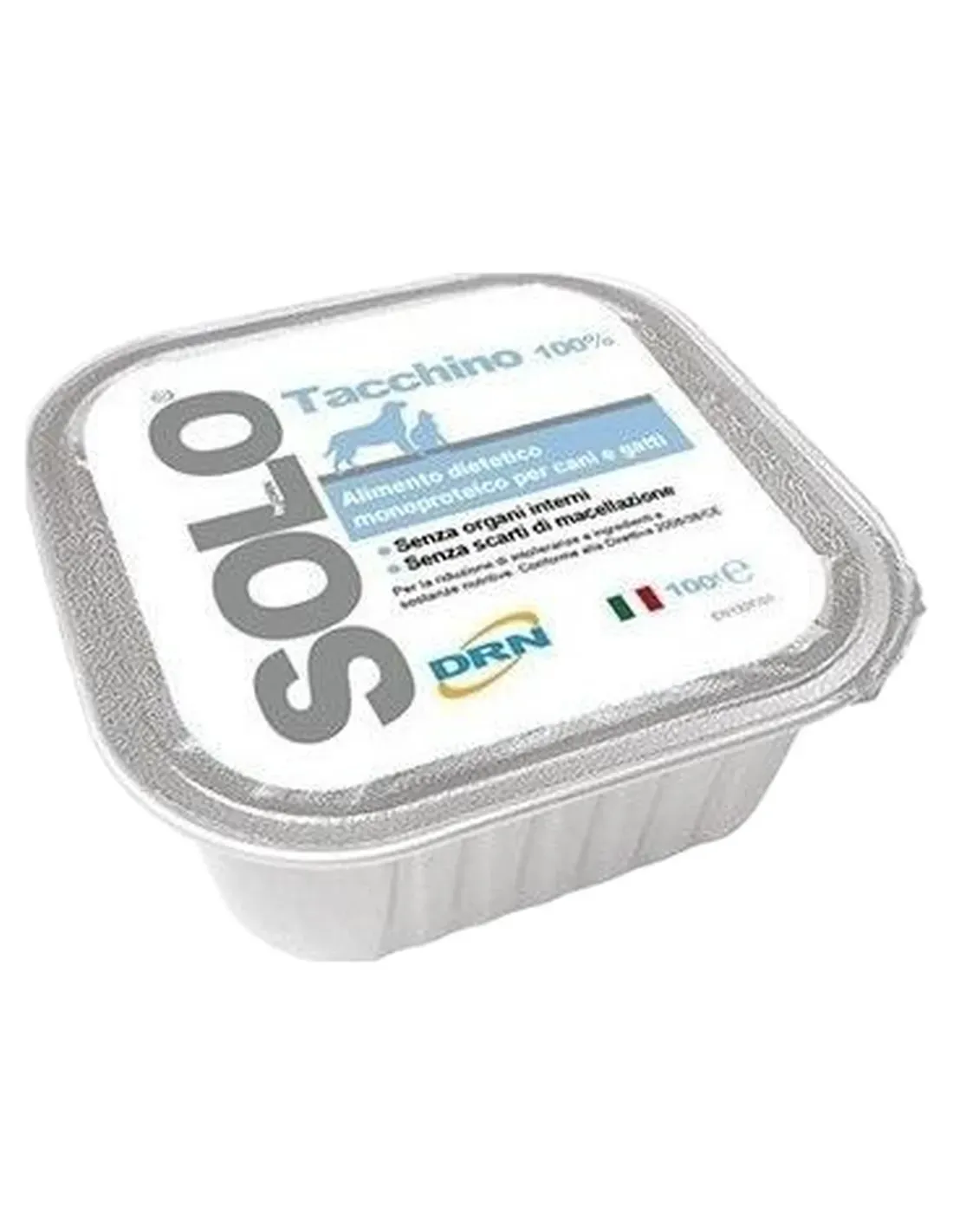 DRN Solo Truthahn 100 g: Monoproteinfutter für Hunde und Katzen mit einer einzigen Proteinquelle (Truthahn), zubereitet aus Fleischstücken, die für die menschliche Ernährung zertifiziert sind, ohne innere Organe oder Konservierungsstoffe.