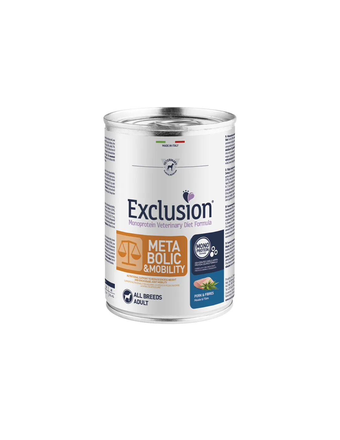 Die Zusammensetzung von Exclusion METABOLIC & Mobility wurde so konzipiert, dass eine ausgewogene Zufuhr aller essentiellen Nährstoffe gewährleistet ist. Schweinefleisch ist die Hauptzutat und liefert hochwertiges, leicht verdauliches Protein. Die Fasern werden sorgfältig ausgewählt, um die Darmgesundheit zu fördern und zur Aufrechterhaltung eines optimalen Körpergewichts beizutragen. Die Formel ist außerdem mit Vitaminen und Mineralstoffen angereichert, um das Immunsystem zu unterstützen und das allgemeine Wohlbefinden des Hundes zu gewährleisten.