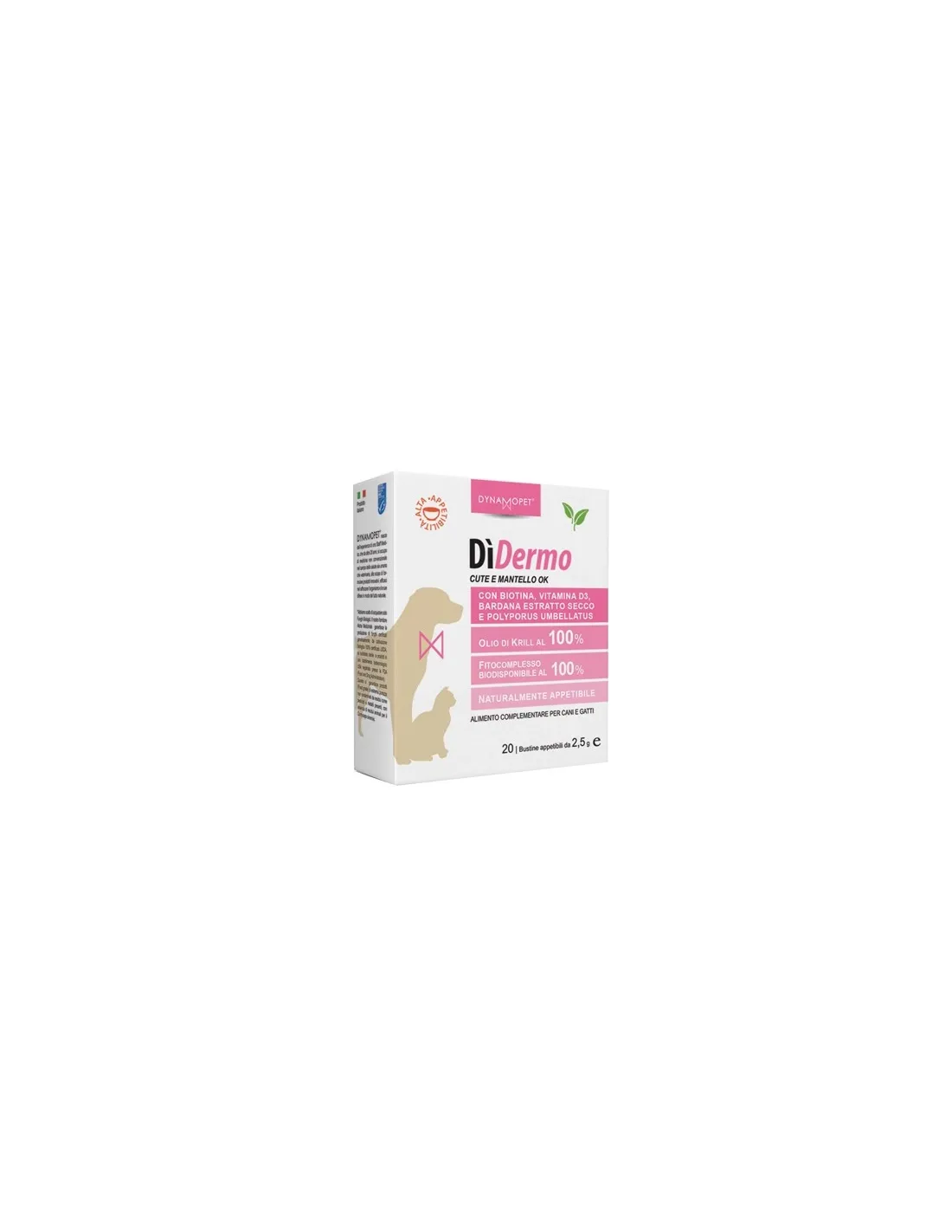 DìDERMO Dynamopet ist ein Ergänzungsfuttermittel zur Unterstützung des physiologischen Wohlbefindens der Haut und der Hautanhangsgebilde. Die Formel ist mit Omega 3 aus Krillöl und Biotin angereichert. Seine Phytokomplexe, kombiniert mit dem Vorhandensein von Omega 3 aus reinem Krillöl mit ausgezeichneter Assimilierbarkeit, machen es zu einem einzigartigen und unverzichtbaren Produkt für das Wohlbefinden des Tieres. Das Produkt zeichnet sich auch durch eine einfache Verabreichung aus, da es vom Gaumen des Tieres so gut angenommen und geschätzt wird, dass es allein verabreicht oder zur normalen Mahlzeit hinzugefügt werden kann, ohne dass das Risiko besteht, dass die Mahlzeit selbst nicht angenommen oder verweigert wird.