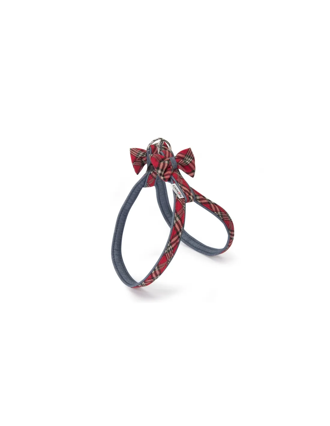 Das Geschirr ist in mittlerer Größe mit einem Brustumfang von 39 cm bis 43 cm erhältlich und eignet sich daher für kleine Hunde. Der Denim-Stoff bietet Stärke und Haltbarkeit, während die Tartan-Einsätze einen Hauch zeitloser Eleganz verleihen. Die vordere Schleife ist das Detail, das den raffinierten Look des Produkts vervollständigt und es ideal für Hundebesitzer macht, die auch beim Spielen und Spazierengehen im Freien nicht auf Stil verzichten möchten.