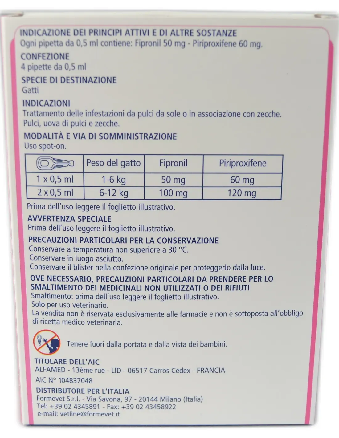 - Katzengewicht: 1–6 kg; Volumen: 0,5 ml; Fipronil (mg): 50; Pyriproxyfen (mg): 60