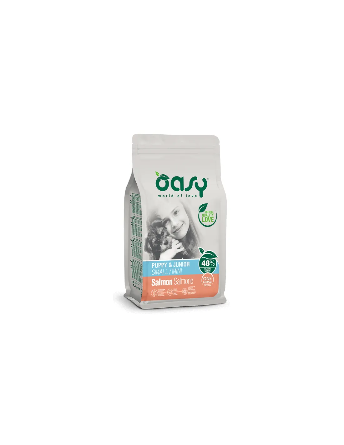 Oasy Dog Monoprotein Puppy&Junior Mini mit Lachs ist für die tägliche Ernährung von Welpen und jungen Hunden kleiner Rassen geeignet. Die Single-Protein-Formel eignet sich besonders für Welpen mit Nahrungsmittelunverträglichkeiten oder -allergien, da sie das Risiko unerwünschter Reaktionen auf das Futter verringert. Dieses Produkt unterstützt die korrekte körperliche und kognitive Entwicklung von Welpen und liefert in den entscheidenden Phasen ihres Wachstums alle notwendigen Nährstoffe.