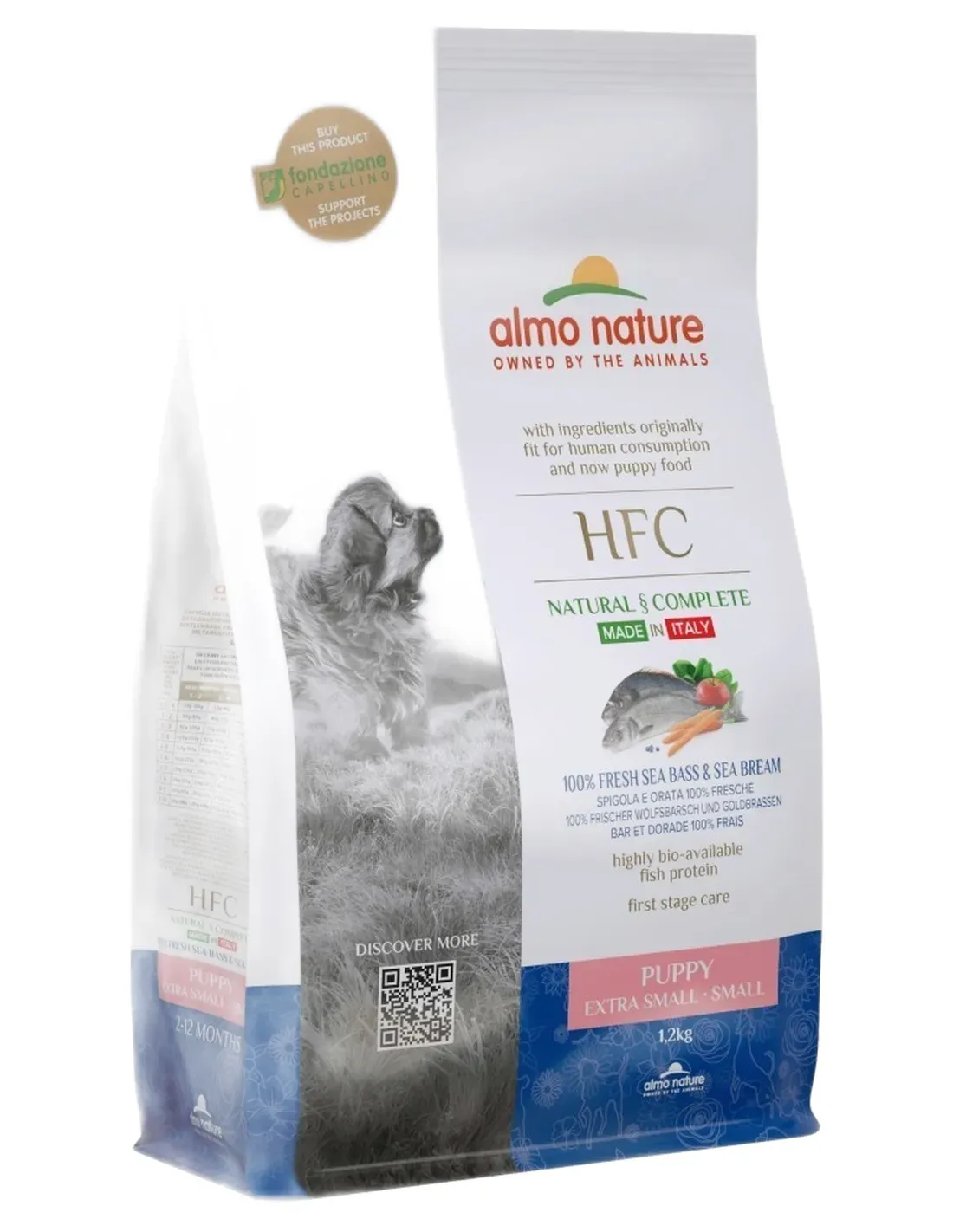 Almo Nature HFC Cane Puppy Wolfsbarsch und Seebrasse 1,15 %, Karotten 1,15 %, Chicorée-Inulin-Quelle für FOS 0,1 %, Mannan-Oligosaccharide 0,1 %.