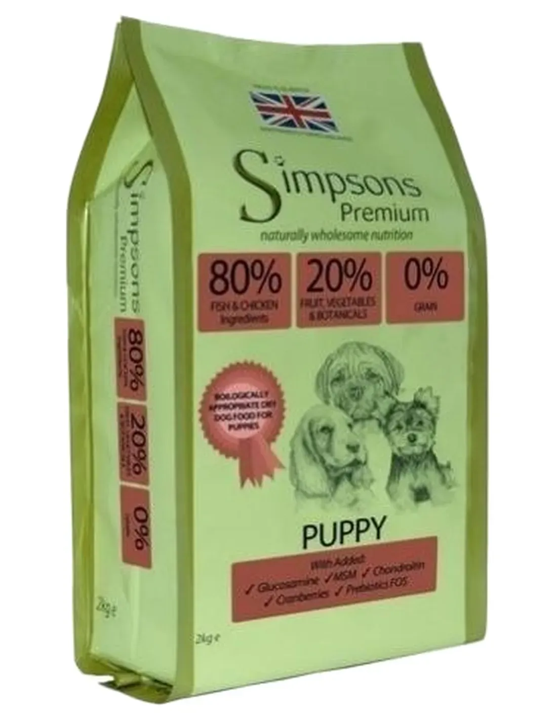 Die Kroketten Simpsons Premium Puppy 80/20 Fisch- und Hühnermischung, hier in einer 2-kg-Packung, sind ideal für Welpen aller Größen und bestehen aus Premium- und getreidefreien Zutaten.