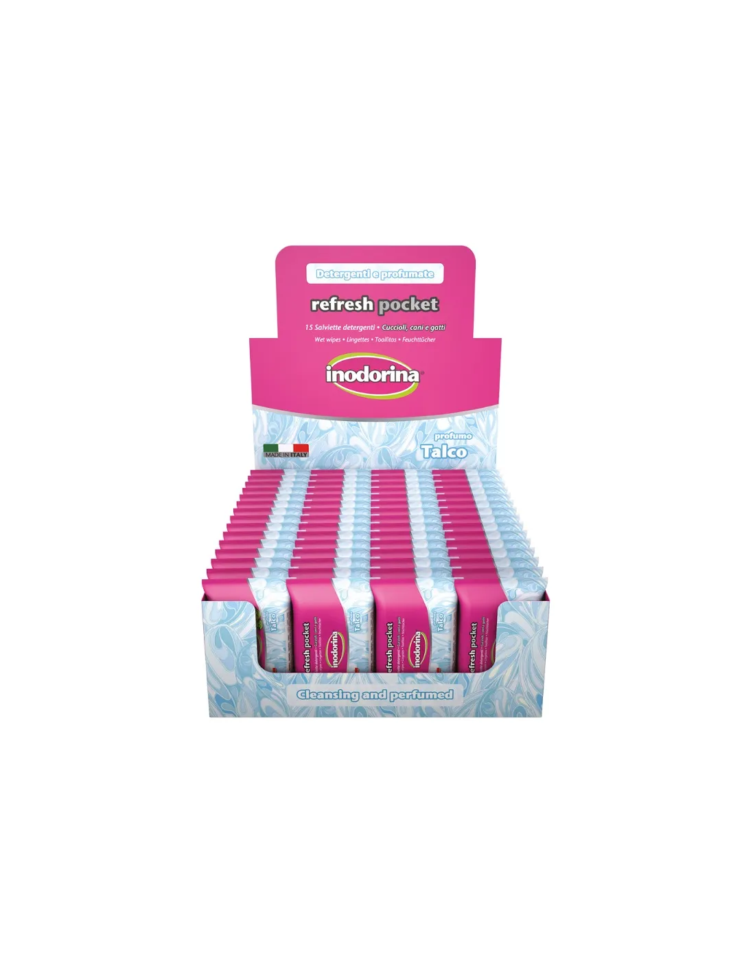 Inodorina Refresh-Tücher sind in zwei Formaten erhältlich: als Taschenpackung mit 15 Stück, ideal für alle, die ständig unterwegs sind, und als praktisches Format mit 110 Stück (100+10 gratis) mit Pop-up-Verschluss, der eine hervorragende Versorgung bei längerem Gebrauch garantiert. Jedes Tuch misst 20 x 30 cm, die optimale Größe für eine vollständige und einfache Reinigung. Dank der verschiedenen verfügbaren Düfte können Sie denjenigen auswählen, der Ihrem Haustier und seinem Geruchssinn am besten gefällt, und so eine individuelle und gezielte Auswahl gewährleisten.