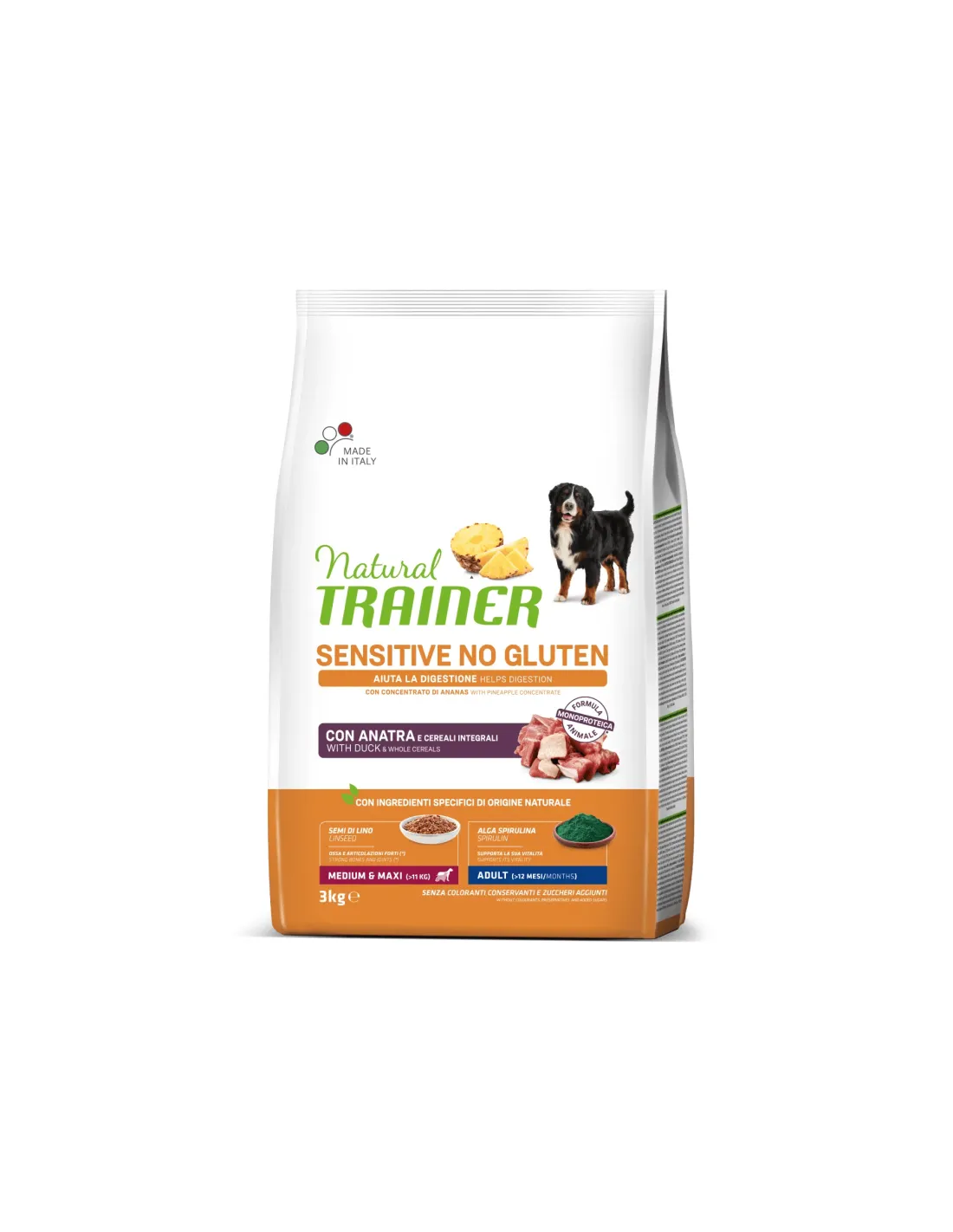Natural Trainer Sensitive Adult Medium Maxi mit Kaninchen 3 kg, Natural Trainer Sensitive Glutenfreies Futter für erwachsene Hunde mit Lachs, 3 kg und Natural Trainer Sensitive Glutenfreies Futter für erwachsene Hunde mit Schweinefleisch – 3 kg sind glutenfreies Futter für erwachsene Hunde mit verschiedenen Proteinquellen.
