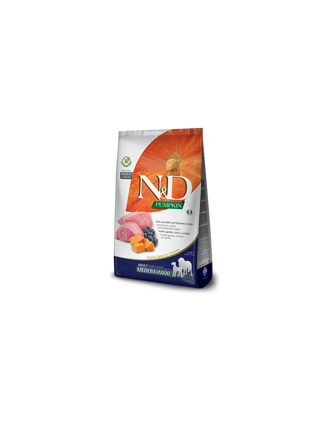 Farmina n&d Pumpkin Grain Free Adult Medium Maxi Lamm, Kürbis und Blaubeere 12 kg ist ein Alleinfuttermittel für ausgewachsene Hunde auf der Basis von Lamm, Kürbis und Blaubeere.