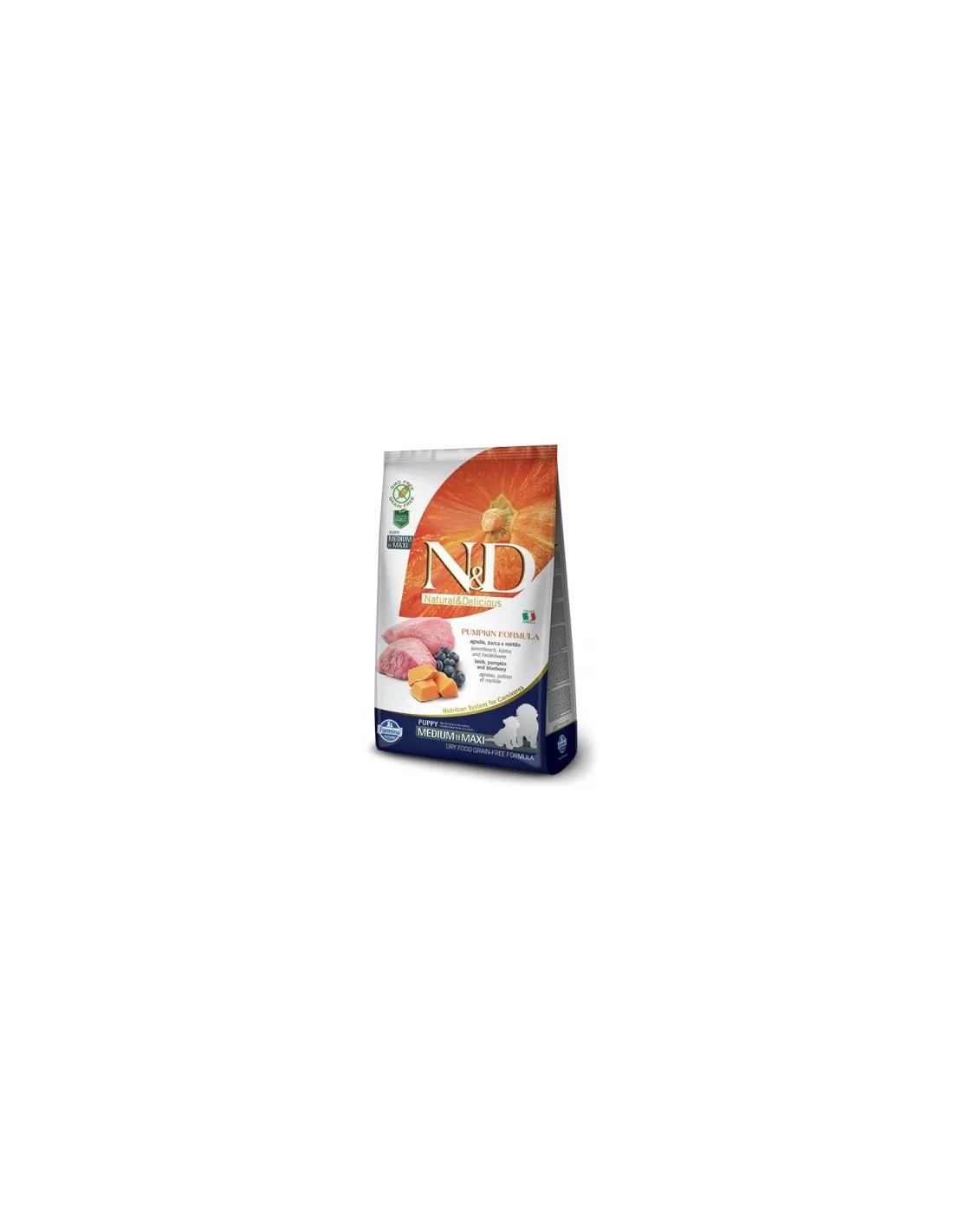 Farmina n&d Pumpkin Grain Free Puppy Medium Maxi Lamm Kürbis und Blaubeere 2,5 kg ist ein Alleinfuttermittel für Welpen und trächtige oder stillende Hündinnen auf Basis von Lamm, Kürbis und Blaubeere.