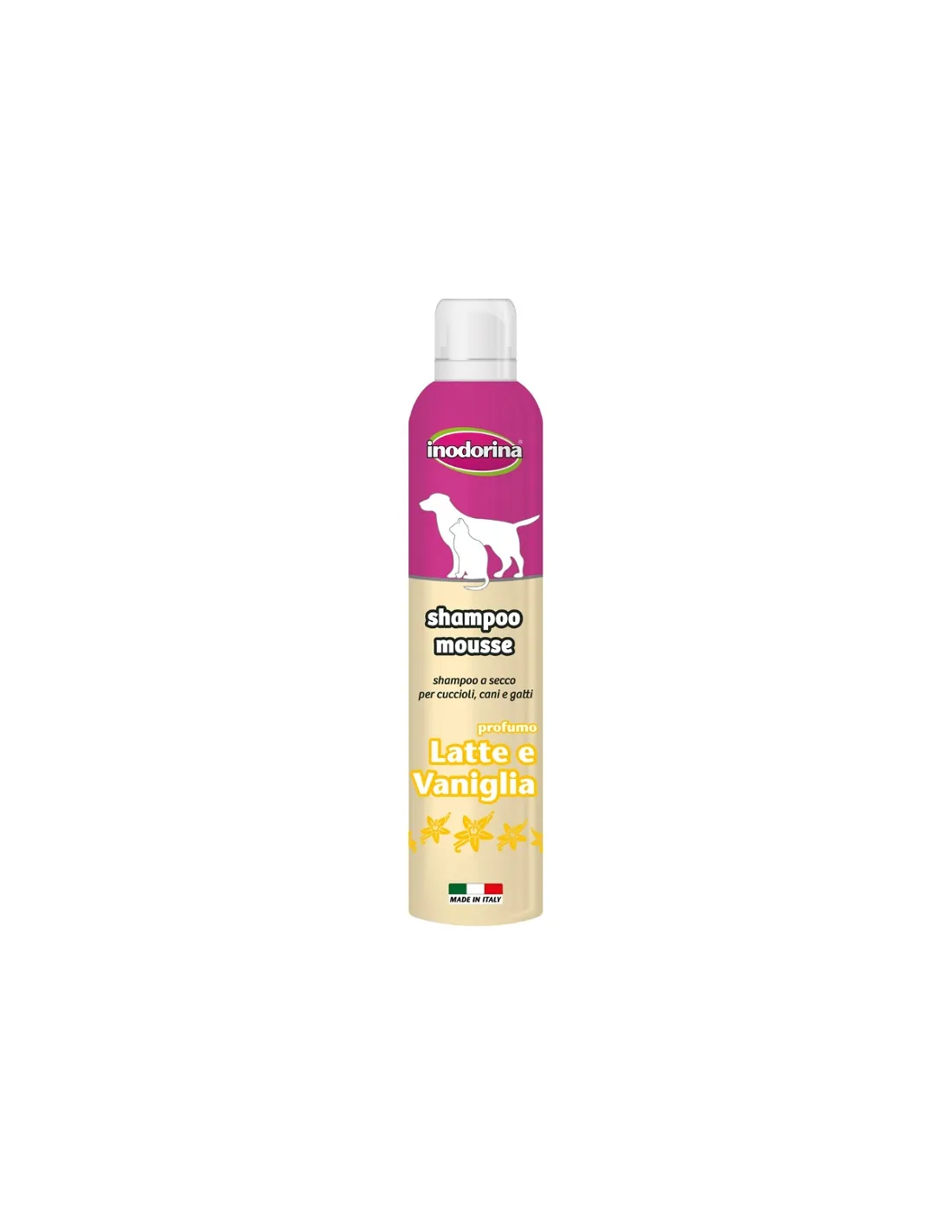 Inodorina Shampoo Mousse Milk and Vanilla wurde für die Anwendung bei Hunden und Katzen aller Rassen und Altersgruppen entwickelt. Durch seine sanfte Formel ist es auch für Welpen und Tiere mit empfindlicher Haut geeignet.