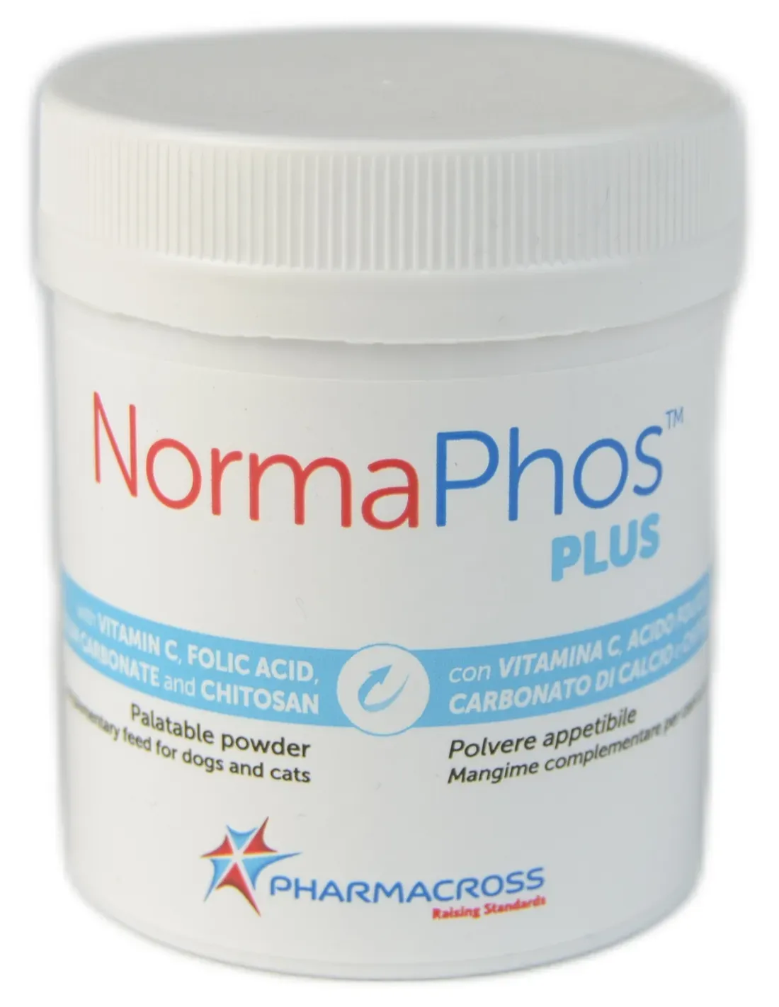 Pharmacross Normaphos Hunde- und Katzenpulver 45 g ist ein Ergänzungsfuttermittel, das den Phosphor von Calciumcarbonat (99 % Reinheit) und Chitosamin (90 % Reinheit) mit den antioxidativen Eigenschaften von Vitamin C (99 % Reinheit) und einem angemessenen Gehalt an Folsäure (99 % Reinheit) kombiniert. NormaPhos® PLUS kann in Verbindung mit einer Nierendiät dazu beitragen, den Phosphorspiegel im Normbereich zu halten, und nicht nur die Funktion der roten Blutkörperchen unterstützen.
