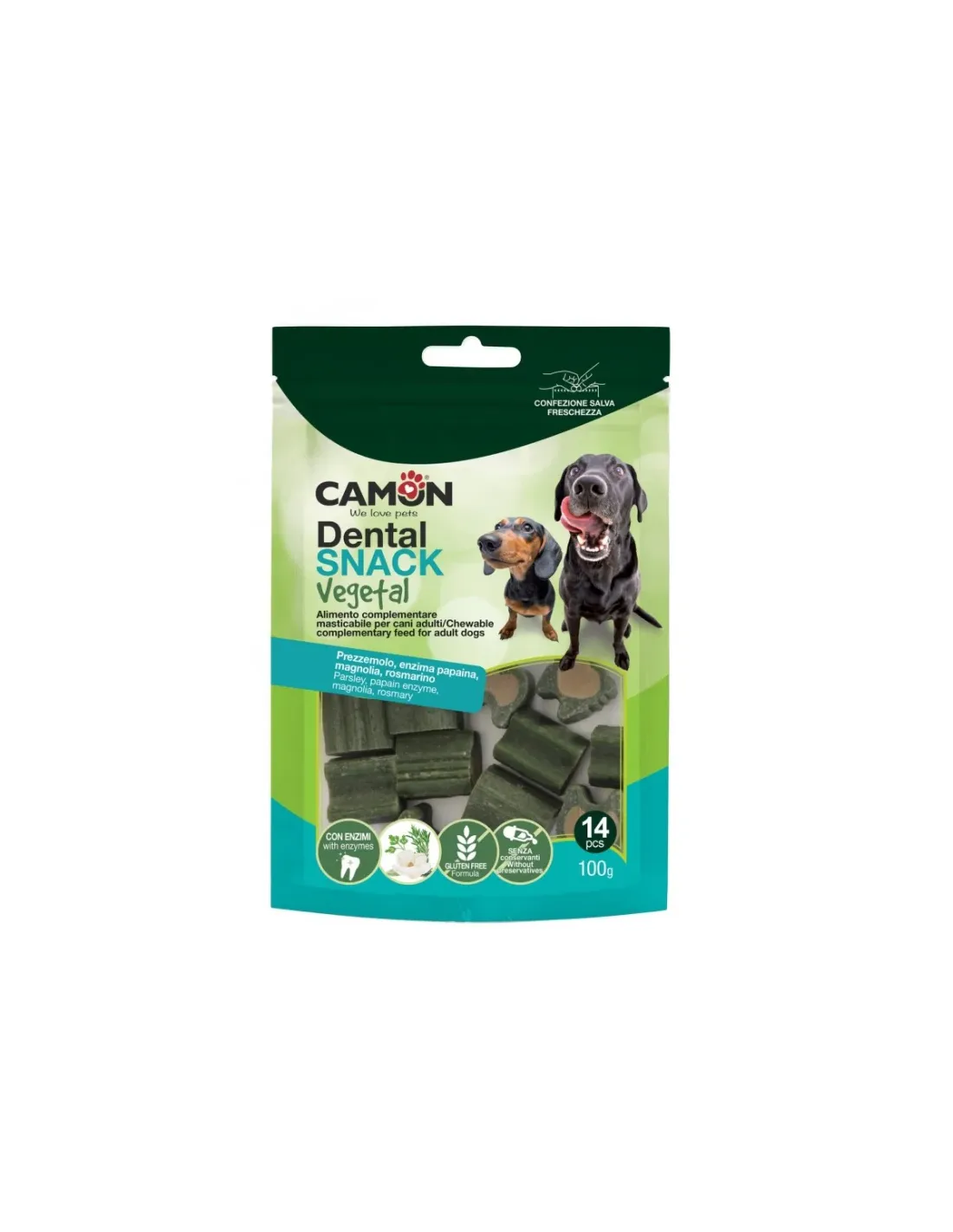 Camon Dental Snack Vegetal Enzybites ist ein innovativer Zahnsnack für Hunde, der die Wirksamkeit von Enzymen mit Inhaltsstoffen pflanzlichen Ursprungs kombiniert, um eine bessere Mundhygiene zu fördern. Dieses Produkt wurde sorgfältig entwickelt, um dank der Wirkung von Papain, einem Enzym, das für seine reinigenden und aufhellenden Eigenschaften bekannt ist, die Bildung von Plaque und Zahnstein zu reduzieren. Jede Packung enthält 14 Snacks mit einem Gesamtgewicht von 100 g, ideal für die tägliche Gabe an Ihren Hund im Rahmen einer umfassenden Zahnhygieneroutine.
